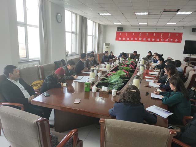 為進(jìn)一步深化創(chuàng)新創(chuàng)業(yè)課程改革,拓寬創(chuàng)新創(chuàng)業(yè)工作思路,10月28日15時(shí),創(chuàng)新創(chuàng)業(yè)學(xué)院在綜合樓11樓會(huì)議室召開了創(chuàng)新創(chuàng)業(yè)學(xué)院教研活動(dòng)啟動(dòng)會(huì)議,副校長(zhǎng)納麗娜、教務(wù)處副處長(zhǎng)哈斯額爾德尼、就業(yè)指導(dǎo)中心主任包倉(cāng)、內(nèi)蒙古心物教育有限責(zé)任公司總經(jīng)理?xiàng)钤约案鞫?jí)學(xué)院推薦的二十余名創(chuàng)新創(chuàng)業(yè)課程教師參加了會(huì)議,會(huì)議由創(chuàng)新創(chuàng)業(yè)學(xué)院院長(zhǎng)哈斯同力嘎主持。