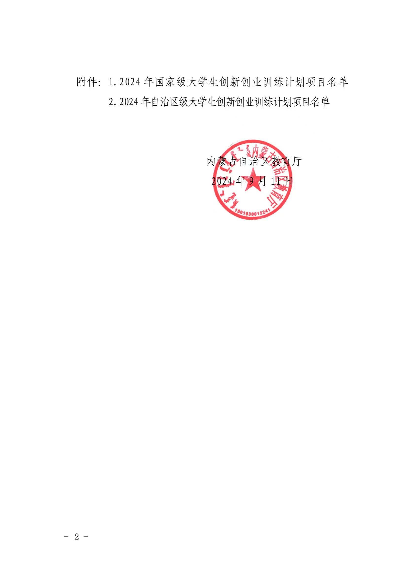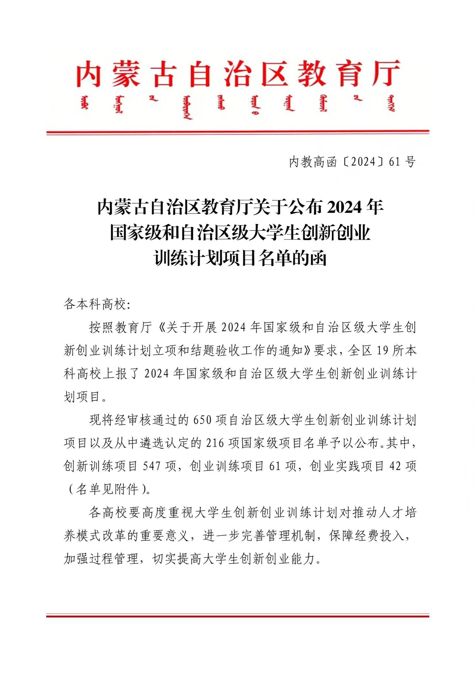 內蒙古自治區(qū)教育廳關于公布2024年國家級和自治區(qū)級大學生創(chuàng)新創(chuàng)業(yè)訓練計劃項目名單的函