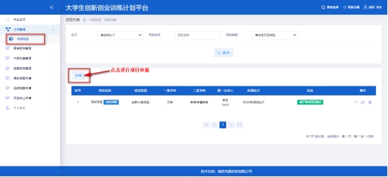 點擊“立項管理”下“申報項目”菜單,點擊“新增”按鈕,申報項目。按照頁面提示填寫項目信息。