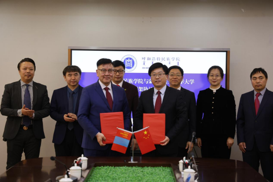 韓偉新與巴·巴薩按蘇荷代表兩校簽署了《呼和浩特民族學(xué)院與蒙古國(guó)生命科學(xué)大學(xué)合作框架協(xié)議書》,兩校與會(huì)人員共同合影留念。