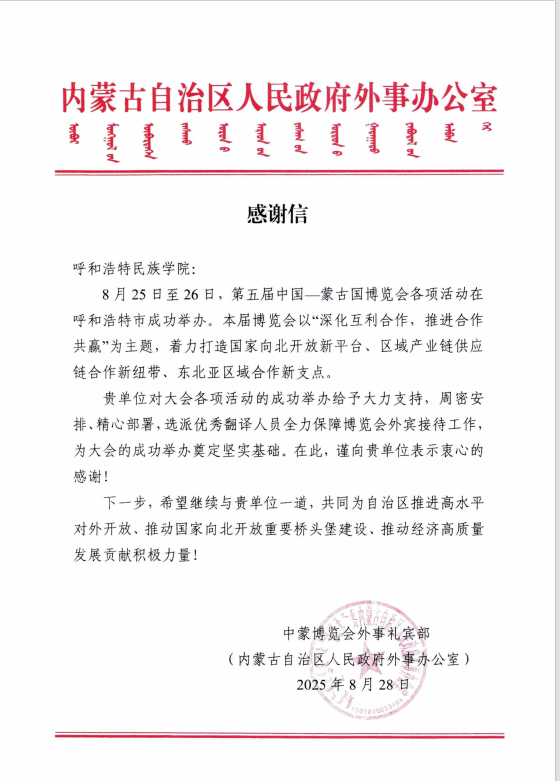8月25日,第五屆中國—蒙古國博覽會在呼和浩特開幕我校外國語學院教師包金蘭、商學院教師巴達拉夫在會議期間擔任翻譯,來自多個專業的60余名學生擔任志愿者,他們以扎實的專業能力、飽滿的服務熱情和嚴謹的工作態度,在多項重要活動中承擔志愿服務與會務支持工作,為推動中蒙交流合作貢獻力量。內蒙古自治區人民政府外事辦公室中蒙博覽會外事禮賓部向我校發來感謝信,對我校志愿者在博覽會期間的突出貢獻予以高度認可。