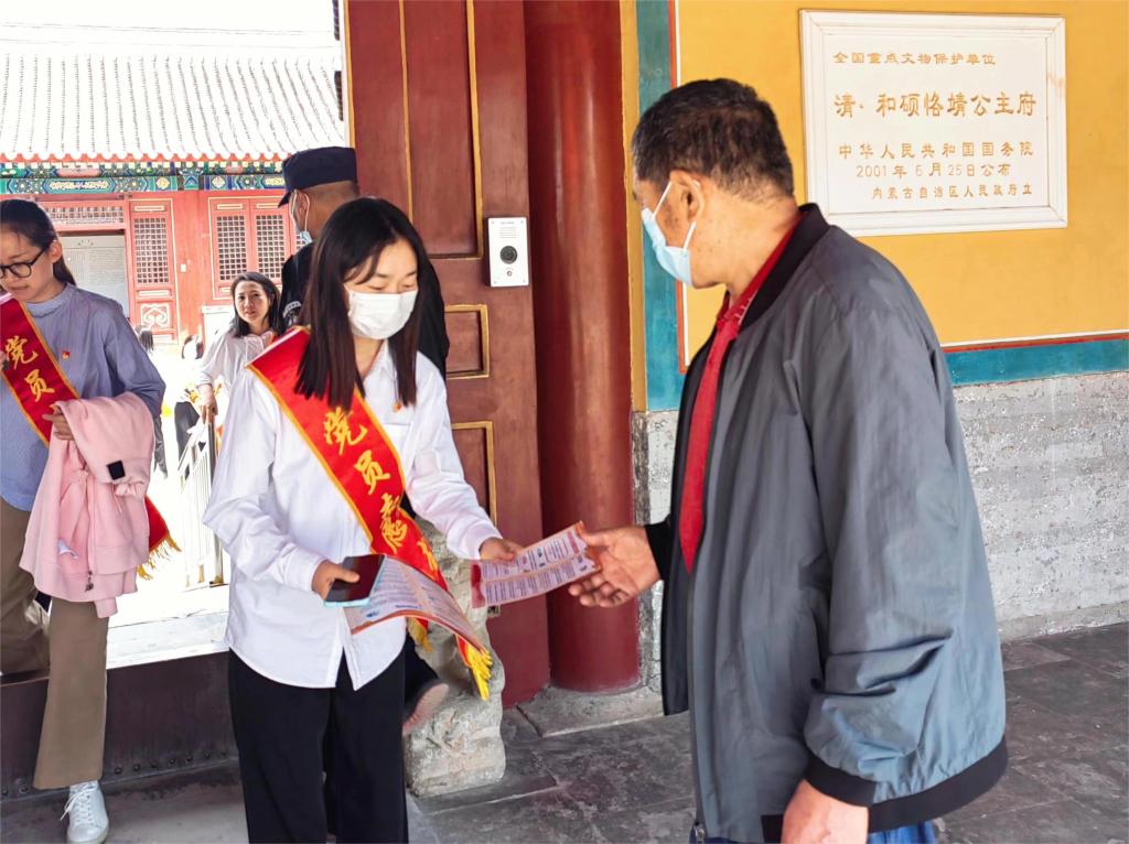 參觀結(jié)束后,學(xué)院黨總支副書記額爾敦格日樂帶領(lǐng)教師與博物館負(fù)責(zé)人進(jìn)行了座談,就安排志愿者服務(wù)、舉辦模擬導(dǎo)游比賽、開展實踐教學(xué)、聯(lián)合申報鑄牢中華民族共同體意識研究項目、共同開發(fā)民族團(tuán)結(jié)主題活動等事項進(jìn)行了深入交流。隨后,學(xué)生黨員志愿者向游客和市民發(fā)放了《中華人民共和國國家通用語言文字法》《內(nèi)蒙古自治區(qū)促進(jìn)民族團(tuán)結(jié)進(jìn)步條例》《文物保護(hù)法》等法律法規(guī)宣傳冊500余份。