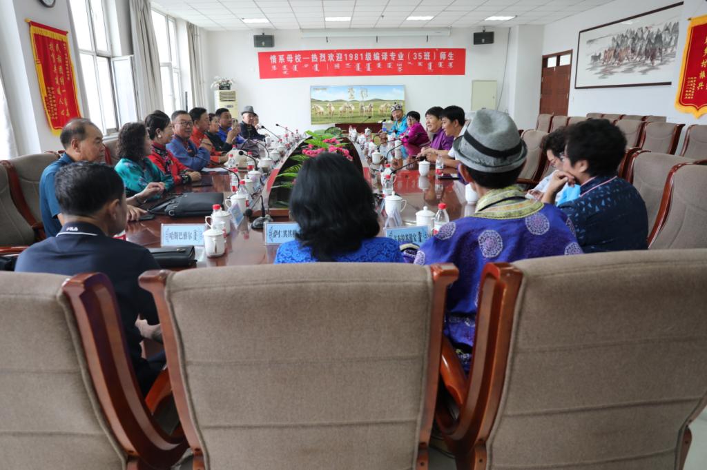 座談會(huì)上,1983屆編譯專業(yè)(35班)校友回憶暢談40年前在母校刻苦就讀的艱苦而美好的青春時(shí)光,介紹畢業(yè)40年來(lái)同學(xué)們不負(fù)母校、奮斗拼搏的干事創(chuàng)業(yè)情況,并表達(dá)了對(duì)母校的感激、關(guān)注與祝福。該班畢業(yè)生大多工作在廣播、電視、報(bào)紙、雜志等文化單位和政府翻譯部門,均已成為業(yè)界的專家,部分校友走上了各級(jí)領(lǐng)導(dǎo)崗位。賽音白乙拉校友——內(nèi)蒙古自治區(qū)民族團(tuán)結(jié)進(jìn)步先進(jìn)個(gè)人、通遼市優(yōu)秀黨務(wù)工作者、扎魯特旗優(yōu)秀共產(chǎn)黨員,通遼市第三屆第四屆政協(xié)委員、扎魯特旗第十二屆人大代表、第八屆第九屆第十屆政協(xié)委員政協(xié)常委,曾擔(dān)任扎魯特旗烏額格其蘇木蘇木達(dá)、黨委書(shū)記,扎魯特旗民族宗教局局長(zhǎng)、旗委組織部副部長(zhǎng)、旅游局局長(zhǎng)、人力資源和社會(huì)保障局黨委書(shū)記、醫(yī)保局局長(zhǎng)、工商聯(lián)主席四級(jí)調(diào)研員、文學(xué)藝術(shù)界聯(lián)合會(huì)三級(jí)調(diào)研員,代表35全班同學(xué)現(xiàn)場(chǎng)朗誦了分別在內(nèi)蒙古新聞網(wǎng)及內(nèi)蒙古日?qǐng)?bào)發(fā)表的作品《母校,我為您喝彩——獻(xiàn)給呼和浩特民族學(xué)院70華誕》。全班同學(xué)向母校贈(zèng)送了“八駿”牌匾,祝母校事業(yè)騰飛,越辦越好,桃李滿天下。