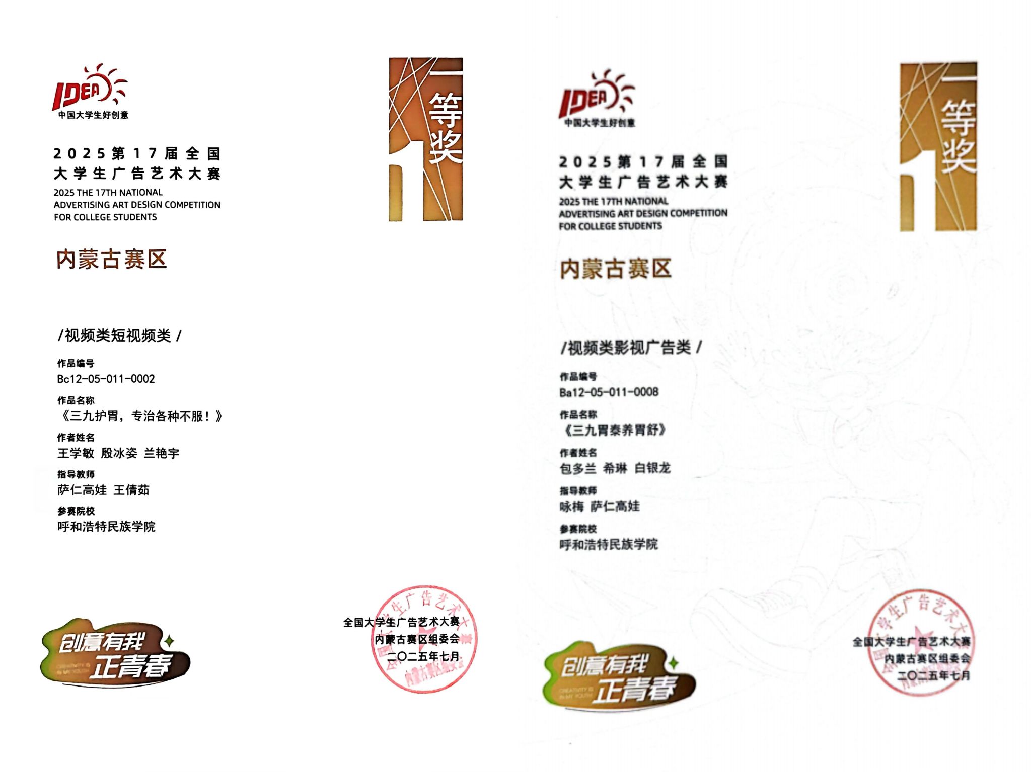 近日,我校新聞傳媒學院學生在“中國大學生好創意”第17屆全國大學生廣告藝術大賽中取得佳績。2023級新聞學班包多蘭團隊斬獲全國優秀獎;王學敏團隊《三九胃泰,專治各種不服!》與包多蘭團隊《三九胃泰養胃舒》雙雙榮獲內蒙古賽區一等獎,樊欣團隊《我們這一“袋”》獲三等獎,霍啟光、閆欣等十名同學獲自治區優秀獎。此前,2022級新聞學班張丹團隊也在第十九屆全國數字藝術設計大賽中奪得內蒙古賽區三等獎。