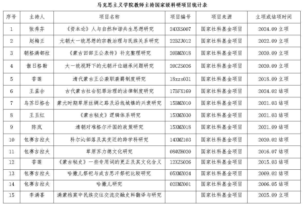目前,學院擁有一批學位、年齡、職稱合理的優秀教師團隊。教職員工33人,其中教授6人,占比18.2%;副教授6人,占比18.2%;博士11人,占比33.4%;碩士20人,占比63.6% ,高層次人才儲備充足;碩士生導師4人、校外兼職博士生導師1人、碩士生導師8人,特聘教授2人,銀齡教師1人,為人才培養注入多元智慧。團隊中涌現出一批國家級、省部級優秀人才:榮獲全國優秀社科普及專家、享受國務院政府特殊津貼專家、自治區“草原英才”、自治區有突出貢獻的中青年專家、內蒙古青年“五四獎章”、入選自治區意識形態領域“四個一批”人才、自治區新世紀“321人才工程”一層次人才、自治區高等教育“111工程”二層次人員1人;入選自治區草原英才創新創業人才、科技英才1人,自治區高校優秀思想政治理論課教師2人、自治區高校最美思政課教師、“盡職圓夢踐行者”—北疆最美教師1人,自治區高校優秀輔導員1人,自治區高校黨課名師1人,自治區高校鑄牢中華民族共同體意識課程“示范性種子”教師2人,近五年獲得全區高校思政課程和課程思政教學技能大賽二等獎1人,獲得自治區高等院校青年教師技能大賽二等獎2人,自治區本科高校教師教學創新大賽中獲得一等獎1人。學院始終堅持“以教促研,以研促教”的原則,不斷推動教學科研發展。專任教師中主持國家社科項目13項,教育部一般項目3項,國家民委項目3項,省部級重點項目4項,一般項目40余項,出版專著9部,主編教材5部。獲自治區哲學社會科學優秀成果二等獎3項,三等獎1項,建設自治區級一流課程1門、自治區在線課程1門、校級在線課程2門、省部級科研創新團隊1個、校級科研創新團隊3個,校級教學創新團隊2個。