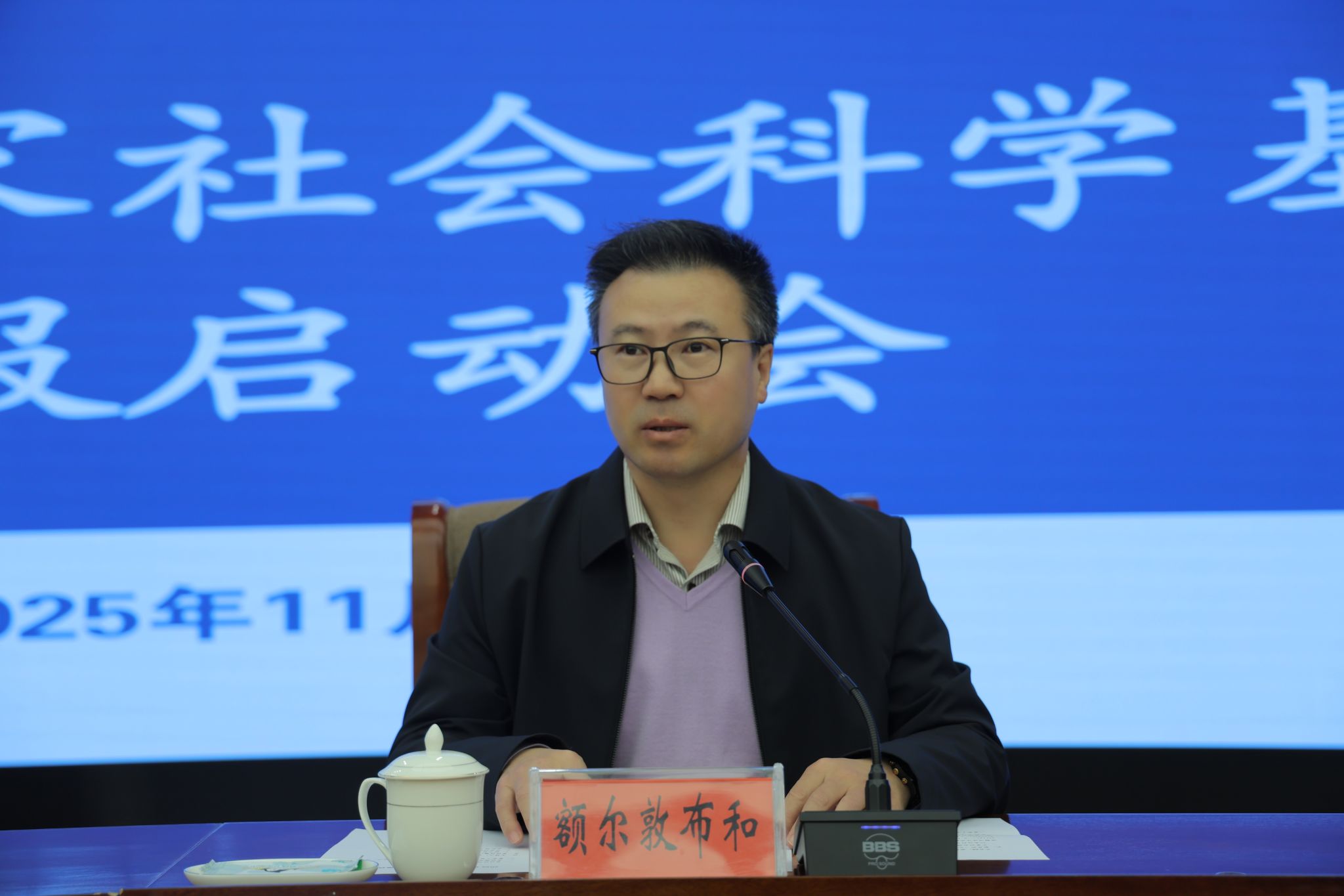 在項目啟動會上,額爾敦布和作動員講話。他強調,國家社科基金項目對推動學校學科建設、促進教師科研成長具有重要意義,并鼓勵與會教師珍惜此次學習機會,認真吸收專家經驗,積極申報項目,切實提升科研創新能力,以更好服務國家戰略發展需求。