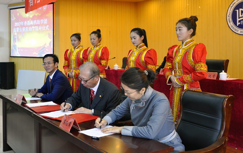 捐贈(zèng)儀式上,內(nèi)蒙古自治區(qū)人民政府副秘書長李闊,內(nèi)蒙古自治區(qū)婦聯(lián)主席胡達(dá)古拉,內(nèi)蒙古財(cái)經(jīng)大學(xué)黨委書記高金祥和海鷗助學(xué)團(tuán)名譽(yù)團(tuán)長李治元先后致辭。隨后,香港海鷗助學(xué)團(tuán)發(fā)起人盧沃棠與我校副院長納麗娜、內(nèi)蒙古財(cái)經(jīng)大學(xué)副校長王立簽訂捐贈(zèng)協(xié)議書。香港海鷗助學(xué)團(tuán)捐贈(zèng)我校助學(xué)金善款共計(jì)870640元人民幣。善長代表、香港海鷗助學(xué)團(tuán)名譽(yù)會(huì)長朱其昆發(fā)言;2017年受助小海鷗田佳成和2007年受助小海鷗徐飛飛先后發(fā)言,表達(dá)了對(duì)海鷗助學(xué)團(tuán)資助的感謝和今后奮發(fā)進(jìn)取的決心和信心。