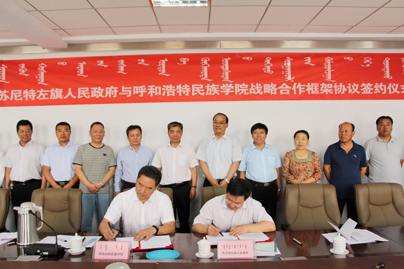 2017年7月7日,我校與蘇尼特左旗人民政府戰略合作框架協議在蘇尼特左旗人民政府舉行。蘇尼特左旗旗委副書記王永軍,旗委常委、副旗長旺海軍,旗人大副主任彭志華,副旗長烏日根牧仁,政協副主席吳巴特爾及政府辦、教科局、人社局、就業局、廣電局、團委負責同志和我校格日樂圖院長、賀希格吉雅副院長、組織部、院辦、教務處、科技處、學生處、團委、就業指導中心負責同志參加簽字儀式。簽字儀式由旗委副書記王永軍主持。