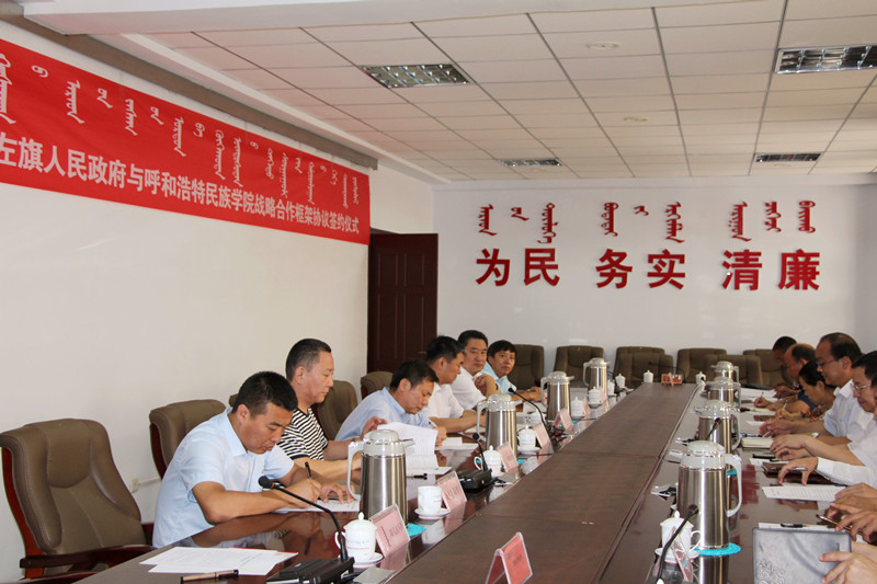 格日樂圖院長在講話中介紹了我校的基本情況、辦學歷史、辦學特色和學科專業特色,以及近年來學校在科研基地建設等方面取得的成績。格院長指出,推動校地戰略合作,加強高校與地方的聯系與交流,促進產學研結合,提高人才培養質量,是高校應盡之責。希望與蘇尼特左旗在人才培養、教學科研及文體方面的應用及推廣、文化旅游和推介招商等方面,加強合作與交流,進一步提高我校的育人水平和服務社會水平,為傳承民族文化,服務民族地區經濟社會發展、推動民族團結進步做出新的貢獻。