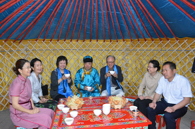 格日樂圖院長在天驕廣場前以蒙古族禮儀迎接了盧沃棠先生一行。