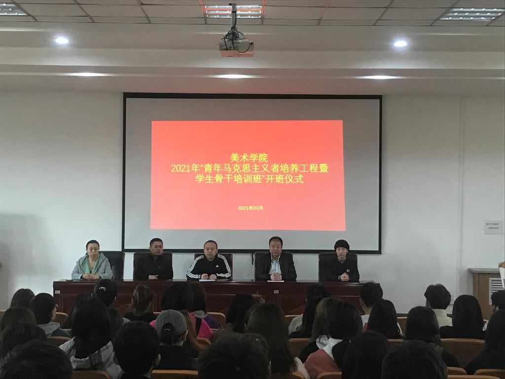 為了深入實(shí)施青年馬克思主義者培養(yǎng)工程,不斷提高學(xué)生的思想政治素質(zhì),積極投身理論學(xué)習(xí),深入學(xué)習(xí)實(shí)踐習(xí)近平新時(shí)代中國特色社會(huì)主義思想,教育引導(dǎo)青年學(xué)生做新時(shí)代中國特色社會(huì)主義的“踐行者”。3月12日上午,美術(shù)學(xué)院在美術(shù)樓四樓階梯教室舉辦了“2021年青年馬克思主義者培養(yǎng)工程暨學(xué)生骨干培訓(xùn)班”開班儀式。會(huì)議由美術(shù)學(xué)院團(tuán)總支副書記魏偉主持,美術(shù)學(xué)院學(xué)生干部、入黨積極分子等110多名同學(xué)參加學(xué)習(xí),學(xué)校團(tuán)委副書記白銀亮,美術(shù)學(xué)院黨總支書記包旭東,黨總支副書記吳利春,副院長高特木樂,副院長塔娜參加了本次開班儀式。