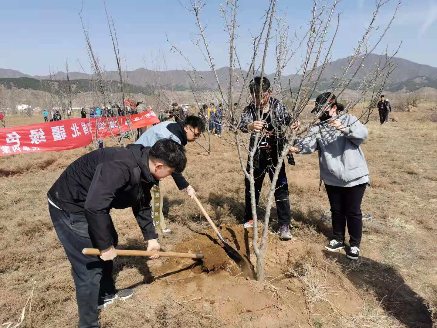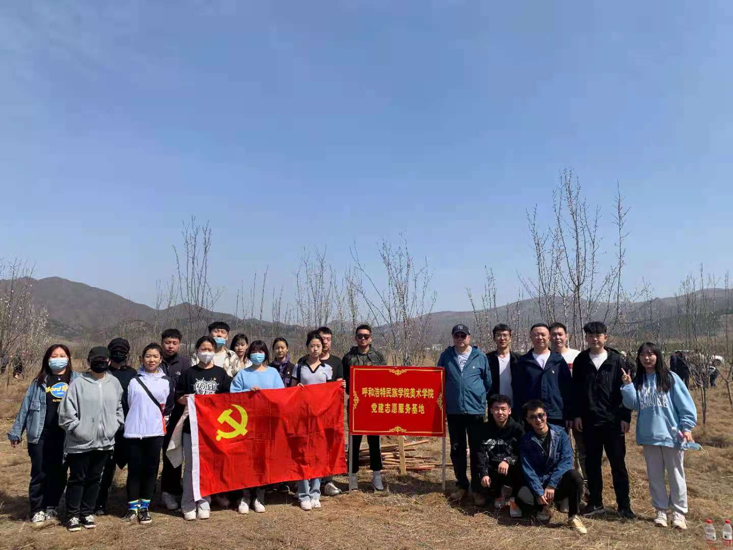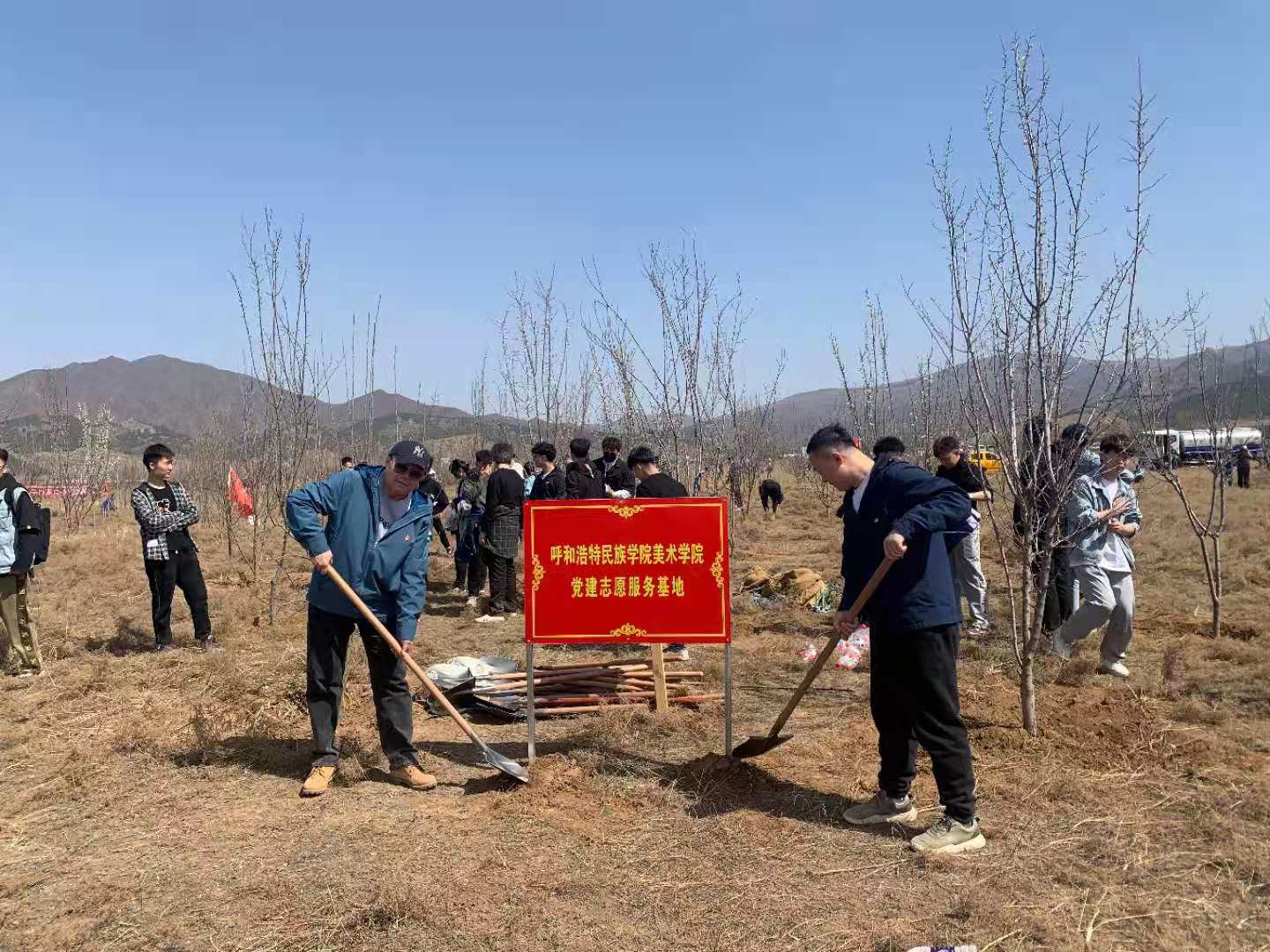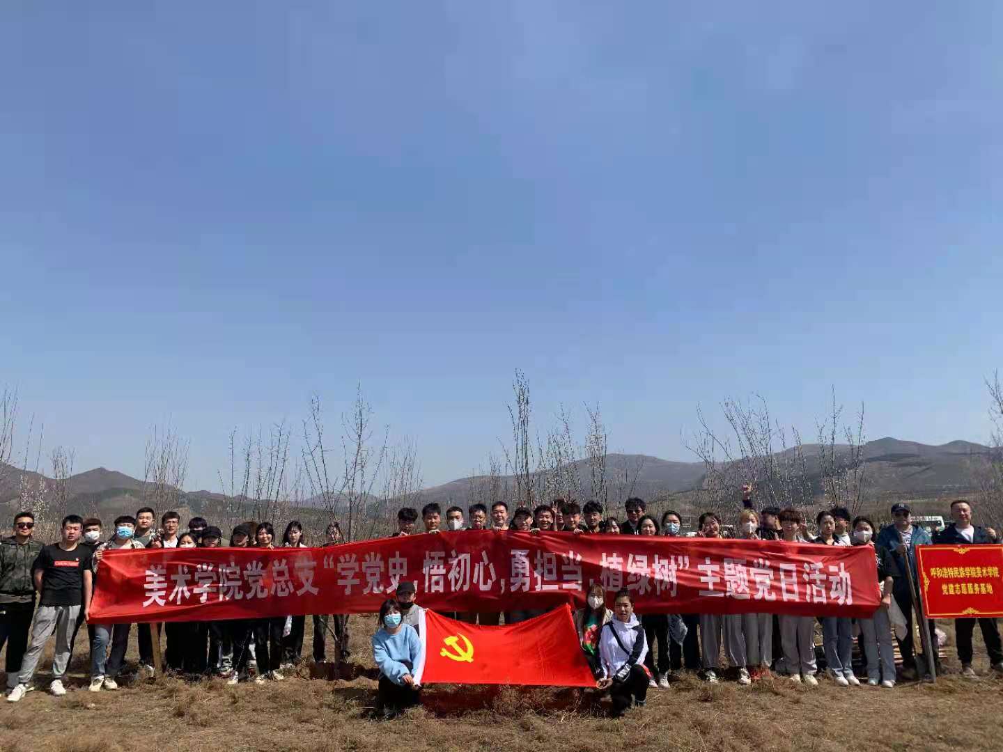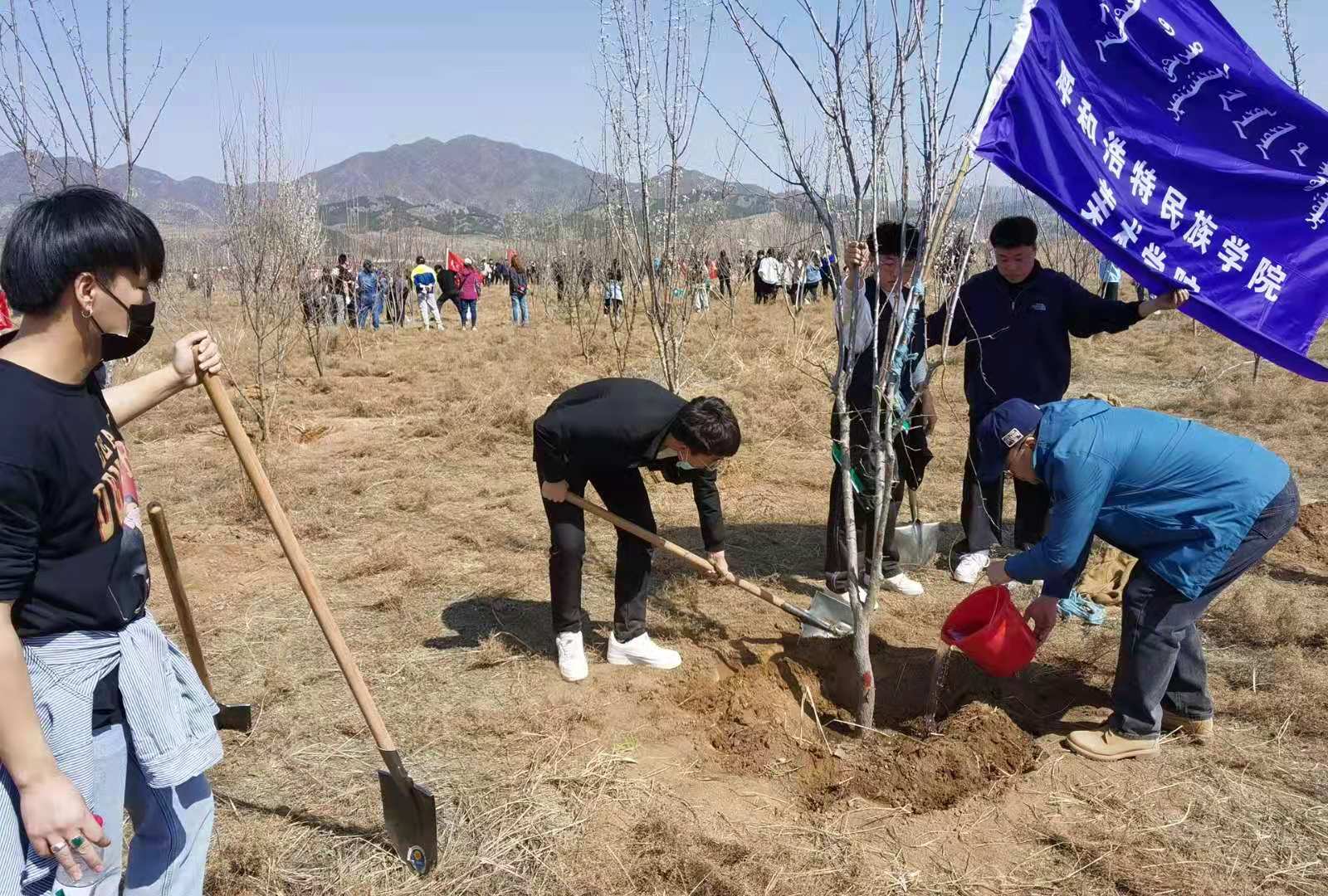 在圣水梁上,美術學院師生黨員們擼起袖子,掄鋤挖坑、手扶樹苗、揮鍬培土、圍堰澆水,每個環節銜接有序,配合默契,干得熱火朝天,呈現了一片“師生黨員添綠意,揮汗植樹黨旗紅”的繁忙景象,在早春和煦的微風中,100多株挺拔的樹苗錯落有致,昂首挺立,展現出勃勃生機。自2019年起至今,美術學院黨總支在圣水梁累計植樹4百多株,今年還舉行了“呼和浩特民族學院美術學院黨建志愿服務基地”的奠基儀式,今后將這里作為學院的黨建實踐基地,長期開展植樹造林活動。