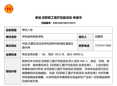 教職工醫療互助工作是一項堅持常態投入聚沙成塔、幫扶重病職工共渡難關的工作。始終牢記“無病我幫人,有病人幫我”的宗旨,團結工人階級最強大的力量。為充分體現學校對教職工的關愛,今年學校工會繼續為495名教職工統一辦理職工醫療互助保險,教職工個人繳納50元,工會繳納40元,自治區總工會補助10元。互助期每期為1年,自2021年6月10日零時起至2022年6月10日二十四時止。