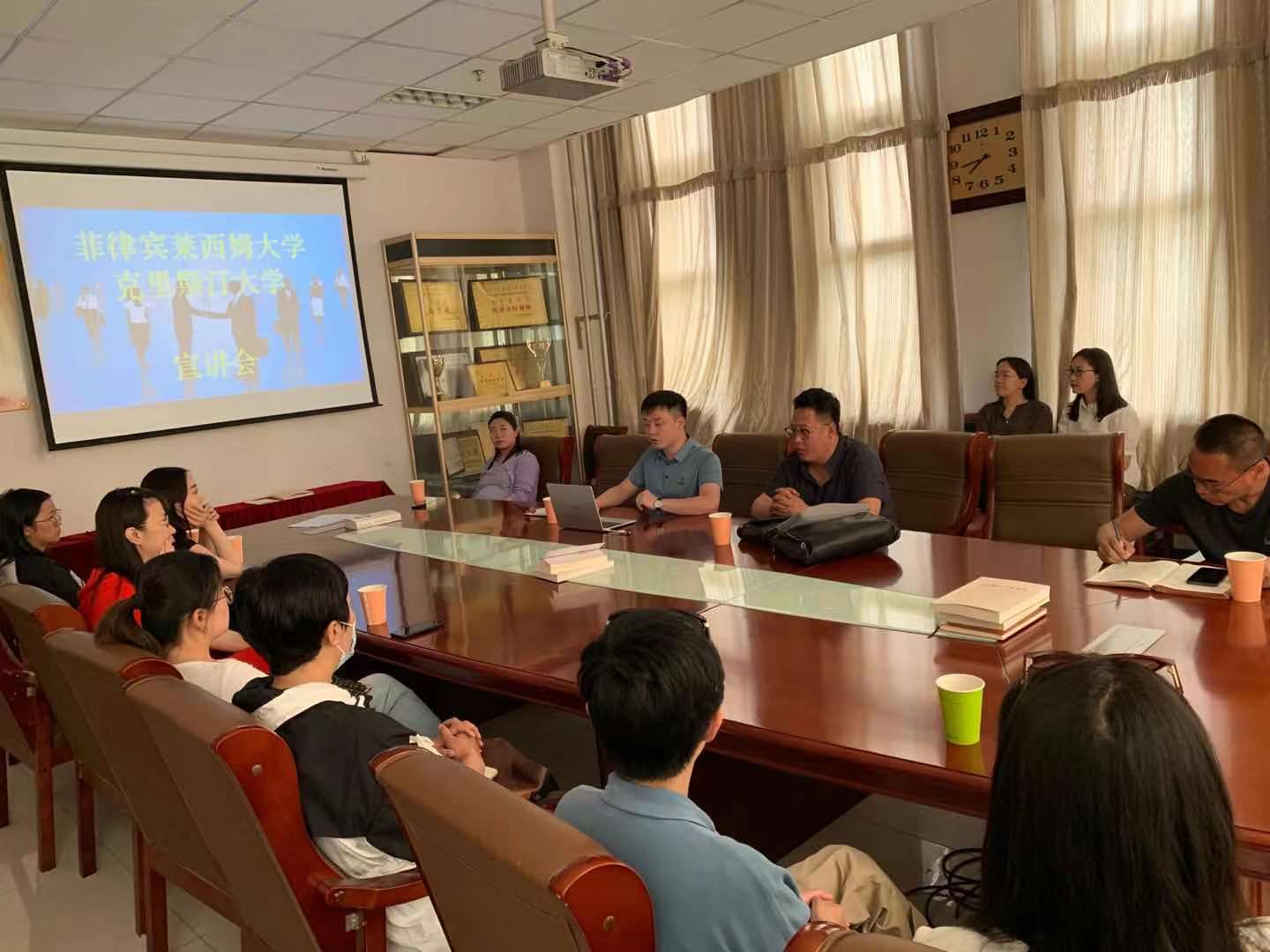 6月11日,菲律賓萊西姆大學(xué)、克里斯汀大學(xué)國(guó)際學(xué)院招生部主任陳兵兵、國(guó)內(nèi)西部招生部主任王志強(qiáng)一行2人來我校在圖書館四樓會(huì)議室舉行宣講會(huì)。我校對(duì)外合作與交流中心負(fù)責(zé)人及有意向赴菲律賓攻讀碩士、博士研究生學(xué)歷學(xué)位的20余名教師參加了宣講會(huì)。