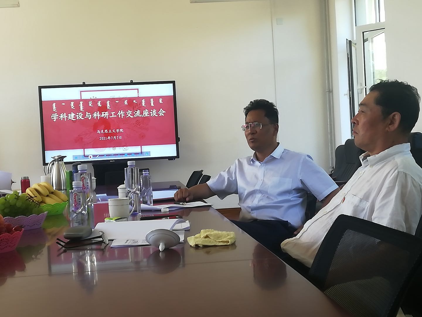 為深入學(xué)習(xí)領(lǐng)會(huì)習(xí)近平總書記關(guān)于教育的重要論述,開展習(xí)近平總書記在慶祝中國(guó)共產(chǎn)黨成立100周年大會(huì)上的重要講話學(xué)習(xí)暨思政課教師集體備課會(huì),進(jìn)一步加強(qiáng)與合作共建單位之間在學(xué)科建設(shè)、師資培養(yǎng)、科研工作方面的交流學(xué)習(xí),馬克思主義學(xué)院于2021年7月4日-7月7日之間特別邀請(qǐng)東北師范發(fā)大學(xué)馬克思主義學(xué)部龐立生部長(zhǎng)和胡海波教授來我院進(jìn)行專題輔導(dǎo)講座和交流座談。7月7日上午9時(shí),龐立生部長(zhǎng)和胡海波兩位教授應(yīng)邀來我院蒞臨指導(dǎo)。上午10時(shí)學(xué)院組織召開了學(xué)科建設(shè)與科研工作交流座談會(huì),會(huì)上,學(xué)院黨總支書記烏蘇日格倉(cāng)教授介紹了學(xué)院學(xué)科建設(shè)及科研總體情況,趙梅蘭副院長(zhǎng)就申報(bào)碩士點(diǎn)的前期準(zhǔn)備情況,以及申請(qǐng)碩士點(diǎn)中存在的短板和不足等問題做了簡(jiǎn)要介紹。龐立生教授和胡海波教授主要圍繞碩士點(diǎn)申報(bào)基本條件(數(shù)據(jù))和目前分階段需要完成的幾項(xiàng)重點(diǎn)工作進(jìn)行闡述。專家指出,首先,要在思想認(rèn)識(shí)上有更進(jìn)一步的提高,以申碩作為契機(jī)帶動(dòng)學(xué)科發(fā)展;其次眼界要開闊,在做好調(diào)研和摸底排查的基礎(chǔ)上整合全校相關(guān)學(xué)科專業(yè)的資源來建設(shè)碩士點(diǎn);再次,對(duì)申報(bào)的專業(yè)方向有更深入的了解,并且分清楚必要條件和充分條件的關(guān)系,必要條件必須要具備,充分條件盡量具備盡量滿足,以點(diǎn)帶面,從一個(gè)問題為切入點(diǎn),力爭(zhēng)做到有機(jī)、有效、有度三機(jī)的結(jié)合。