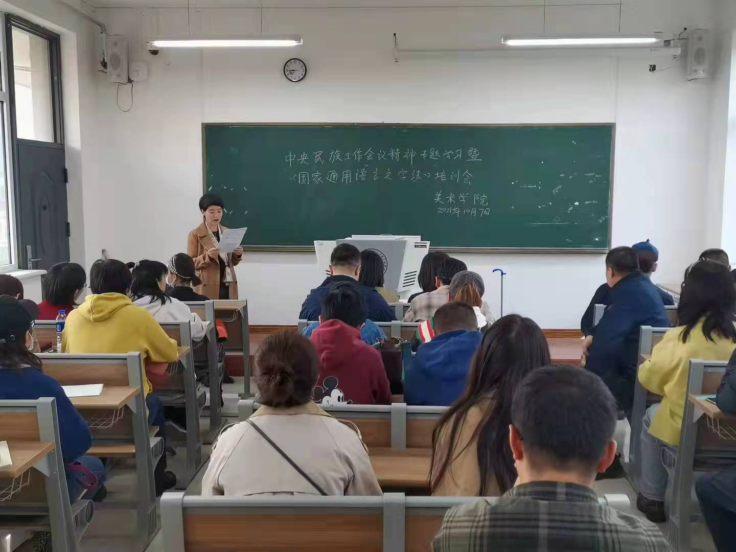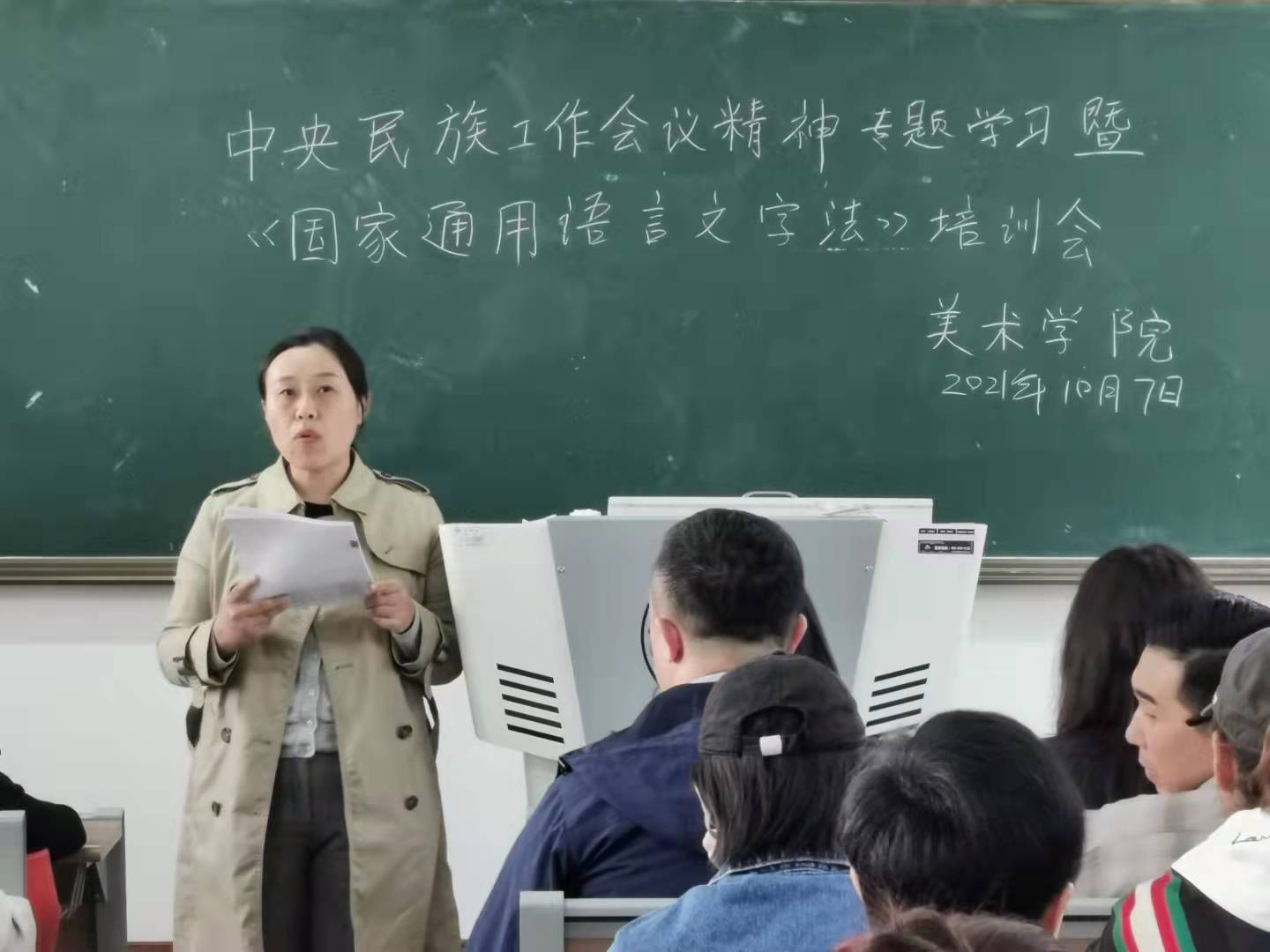 為了深入學習貫徹習近平總書記在中央民族工作會議上的重要講話精神,圍繞黨史學習教育,強化鑄牢中華民族共同體意識教育,持續推進國家通用語言文字使用工作,不斷加強師德師風建設工作,10月7日下午,美術學院在崇正樓313教室召開全體教師專題學習培訓會議,會議由副院長塔娜主持,全體教職工、外聘教師50多人參加會議。