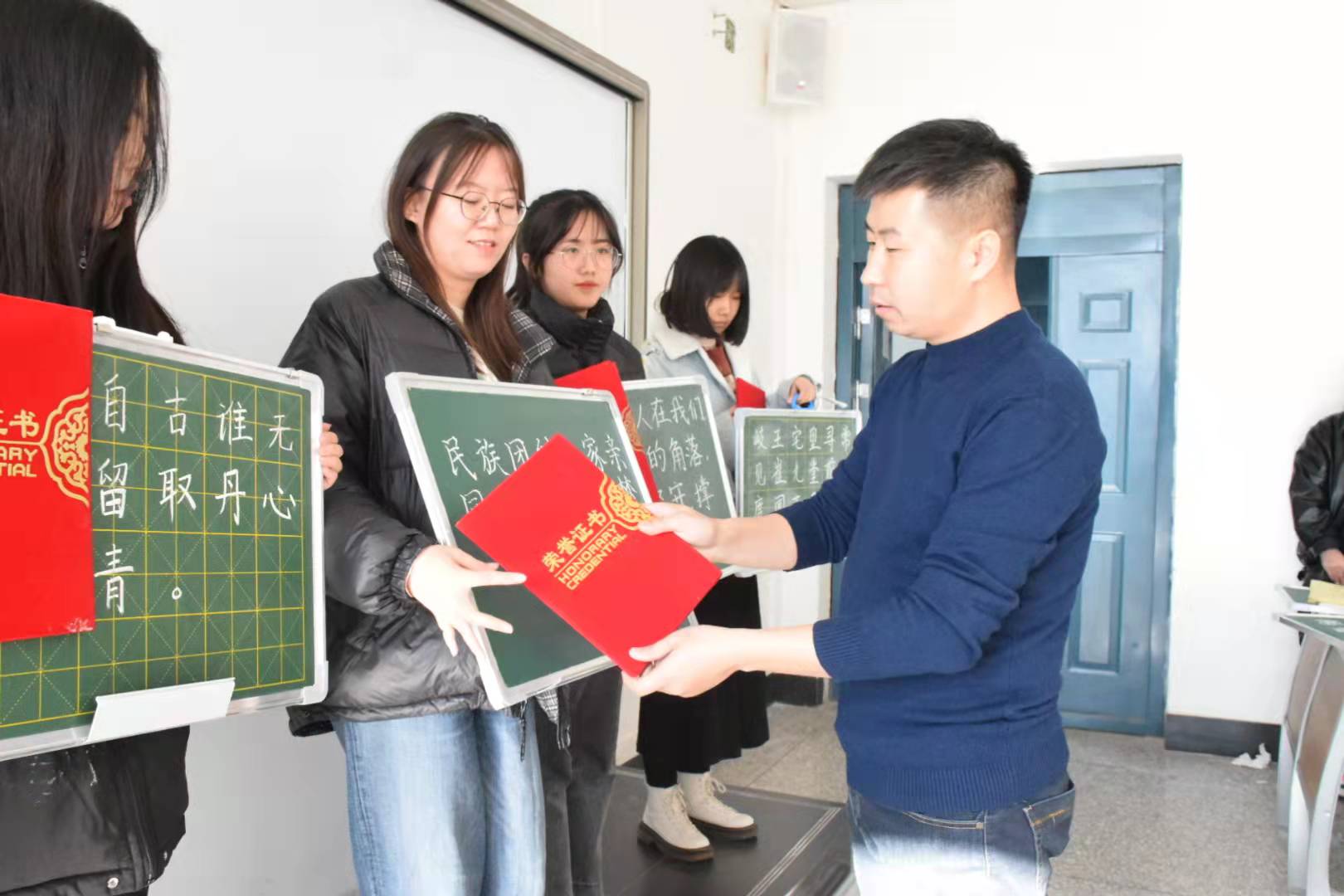 本次“三筆字”比賽分為硬筆字組、軟筆字組、粉筆字組,要求參賽選手到指定教室以表現民族團結為主題進行現場書寫作品并提交。為確保評選公平公正,比賽作品邀請書法教師匿名方式評審,最終陳小燕榮獲毛筆字組一等獎勵,趙亞楠、徐佳婕榮獲毛筆字組二等獎勵,劉寧榮獲毛筆字組三等獎勵。趙亞楠榮獲鋼筆字組一等獎勵,陳小燕、楊伽瑩榮獲鋼筆字組二等獎勵:鄧佳、徐嘉婕、劉蓉榮獲鋼筆字組三等獎勵。趙亞楠榮獲粉筆字組一等獎勵,王楠,郭佳辛榮獲粉筆字組二等獎勵,劉蓉、許永諾、謝欣雨榮獲粉筆字組三等獎勵。