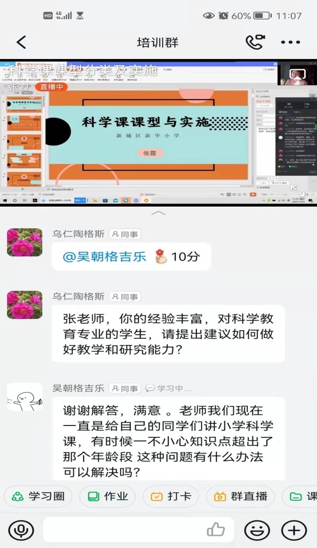 張霞老師以“科學(xué)課課型與實(shí)施”為題目,從教學(xué)設(shè)計(jì)、課堂管理、啟發(fā)式教學(xué)等多方面給學(xué)生做了一次精彩的講座。專題講座后,張霞老師與學(xué)生進(jìn)行了深入的討論與互動(dòng),在線為學(xué)生答疑解惑,得到了學(xué)生們得廣泛好評(píng)。