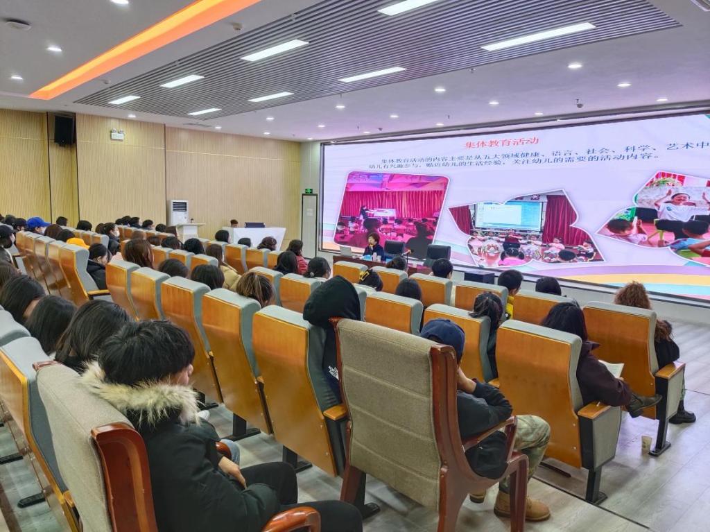 計爽園長首先對新城區第一幼兒園的發展歷程及園所環境進行了簡要介紹,接著用大量圖片,向同學們傳遞環境創設這門“隱性課程”的重要感染力。還結合幼兒園實地拍攝的視頻,以幼兒一日生活為主線,帶領同學們一起探尋幼兒的“秘密”,真實展現幼兒的一日生活環節。最后,計園長結合自身從教經驗,就如何做好一名合格的幼兒園教師與同學們進行了充分交流。她認為,一名合格的幼兒園教師,要牢固樹立教書育人、立德樹人的職責使命;要有扎實的專業知識和過硬的業務能力;要有高度的責任心;要寬嚴相濟、愛之有度;要時刻樹立安全第一的思想;要積極做好家長工作。鼓勵同學們把握最好的時代,明確自己的目標,志當存高遠,行當積跬步。