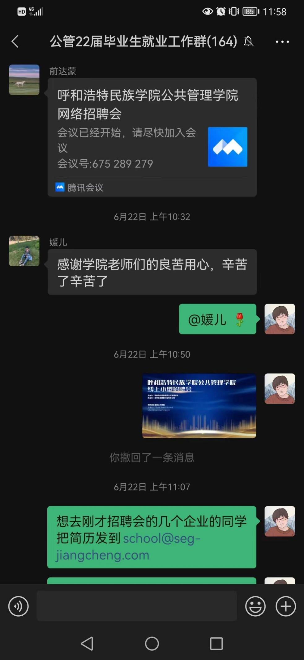 學校黨委推進就業工作的相關要求,促進校企深度融合發展,全力做好我院畢業生更加充分、更高質量就業,滿足我院廣大畢業生求職需求,公共管理學院攜手北京匠成教育科技有限公司于2022年6月22日舉辦了2022屆畢業生企業宣講招聘會。會議由黨總支副書記額爾敦格日勒主持。