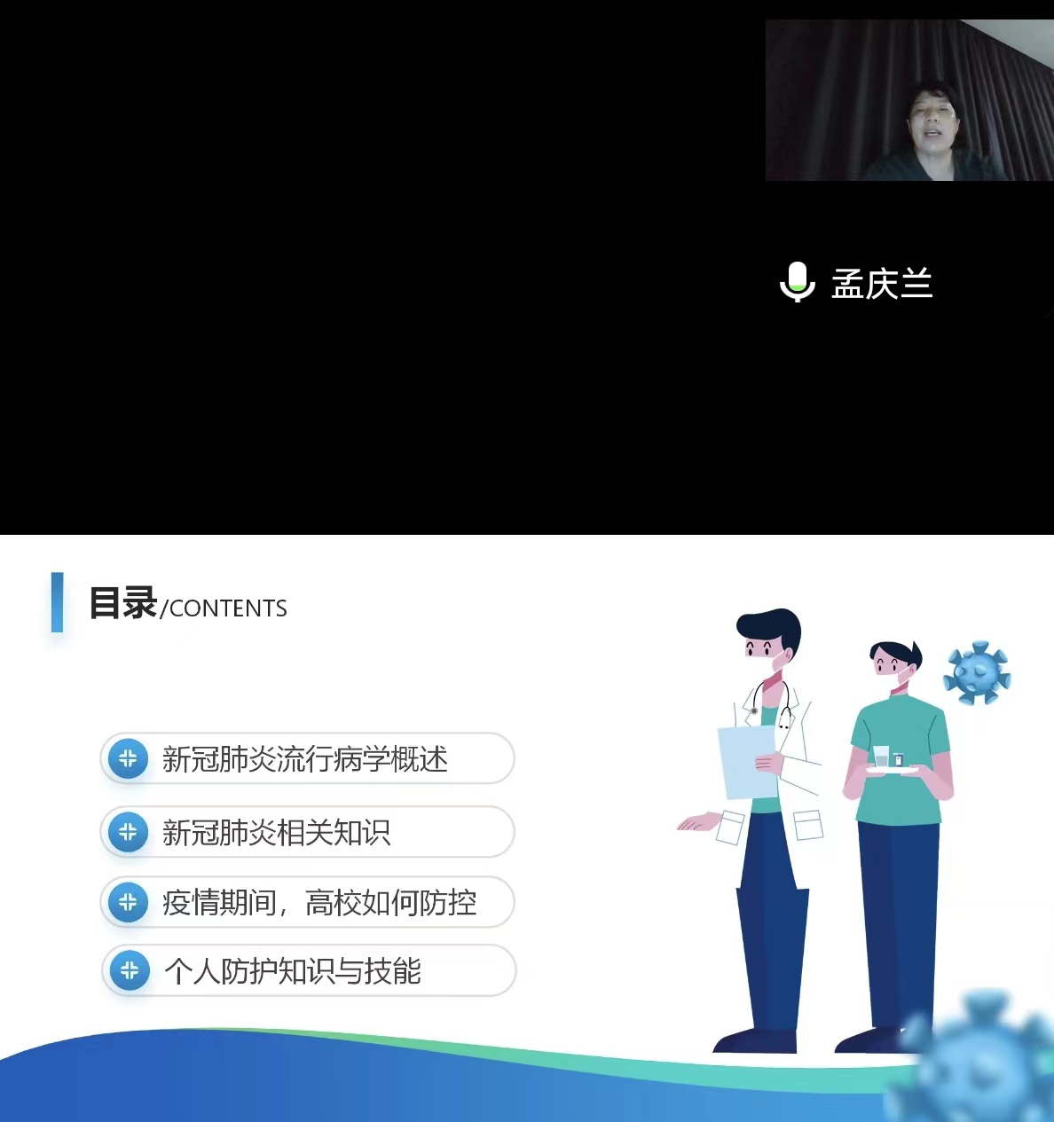 培訓會上,內蒙古醫科大學附屬醫院院內感染科主任,內蒙古自治區院感質控中心主任,內蒙古自治區新型冠狀病毒肺炎疫情防控指揮部醫療救治感控組長,國家衛生健康委感染預防與控制專家委員會委員孟慶蘭教授,結合當前疫情形勢,圍繞新冠流行病學概述、新冠相關知識、疫情期間高校如何防控、個人防護知識與技能等四個方面進行了詳細的講解,引導教職工進一步增強科學防范的意識。