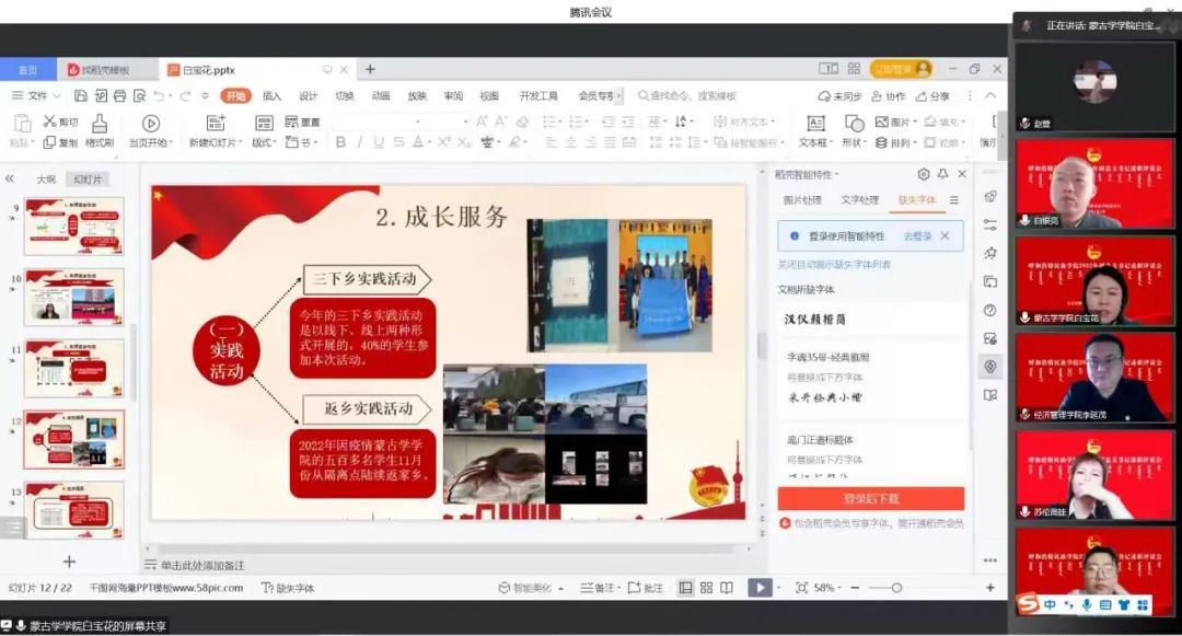 最后,團(tuán)委書記蘇倫高娃在總結(jié)中肯定了2022年度我校各級(jí)團(tuán)組織的工作和取得的成績,客觀分析了當(dāng)前我校基層團(tuán)組織工作中存在的不足,并明確了下一步的努力方向和工作要求。她要求:一要提高政治站位,強(qiáng)化責(zé)任擔(dān)當(dāng)。二要強(qiáng)化思想政治教育,引領(lǐng)廣大團(tuán)員青年堅(jiān)定不移聽黨話、跟黨走,樹立正確的歷史觀、民族觀、國家觀。三要把牢工作底線,做好防范化解團(tuán)學(xué)領(lǐng)域風(fēng)險(xiǎn)各項(xiàng)工作。四要加強(qiáng)基層團(tuán)組織自身建設(shè),抓好團(tuán)員青年的管理和教育,著力提升服務(wù)青年的能力和水平,增強(qiáng)團(tuán)組織的凝聚力。