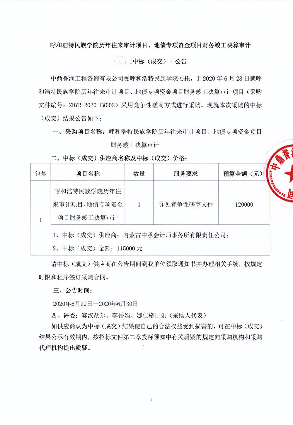 呼和浩特民族學院歷年往來審計項目、地債專項資金項目財務竣工決算審計中標(成交)公告