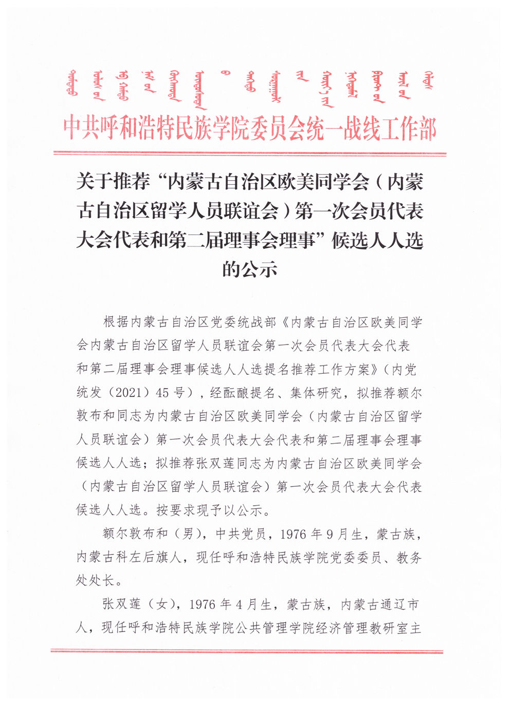 關于推薦“內蒙古自治區歐美同學會(內蒙古自治區留學人員聯誼會)第一次會員代表大會代表和第二屆理事會理事”候選人人選的公示