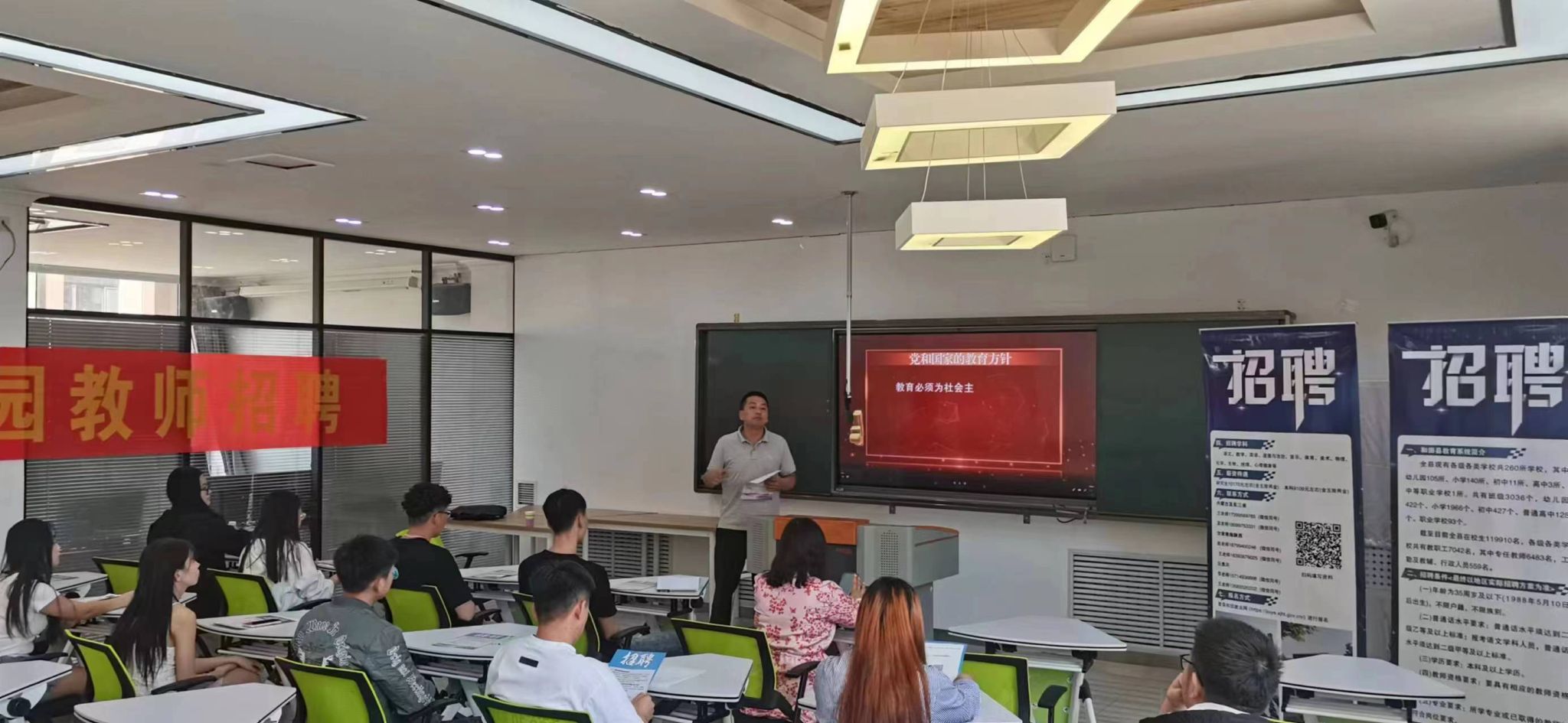 宣講會上,和田縣教育局招聘負責人播放了《和田縣教育系統招聘宣傳片》,并介紹和田縣教育局本次招聘教師報考流程、招聘條件、招聘學段、工作環境、住宿環境及薪資待遇。最后,和田教育局招聘負責人就學生關心的交通、福利待遇、職稱評定、在職深造等問題與單位進行答疑解惑。