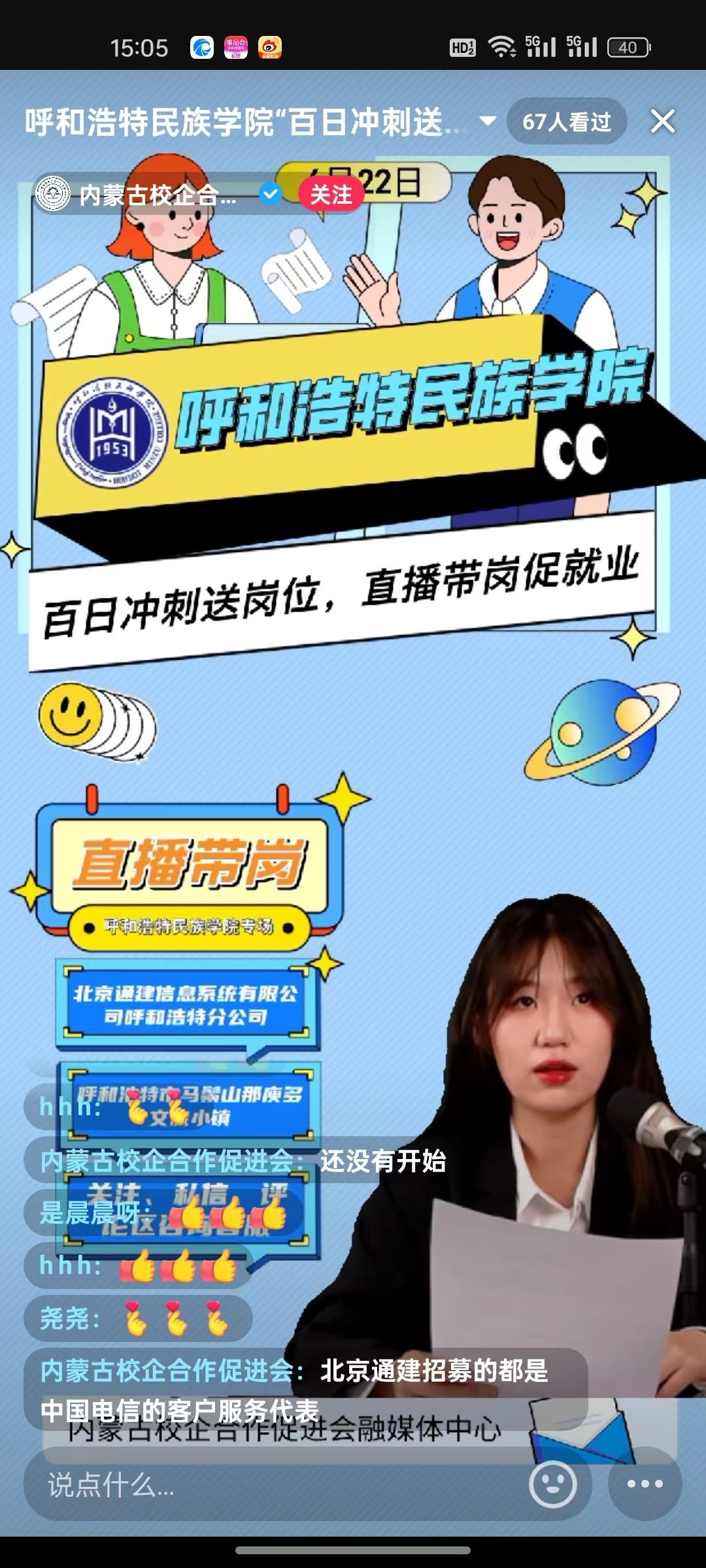 本次直播帶崗活動是學(xué)校“百日沖刺”促就業(yè)攻堅行動的一部分。下一步,學(xué)校將持續(xù)為畢業(yè)生精準(zhǔn)搭建就業(yè)供需平臺,解決暑期線下招聘受時間、場地限制等問題,降低畢業(yè)生搜尋招聘信息的時間成本,實現(xiàn)就業(yè)服務(wù)和就業(yè)崗位的觸屏可及,確保畢業(yè)生高質(zhì)量充分就業(yè)。