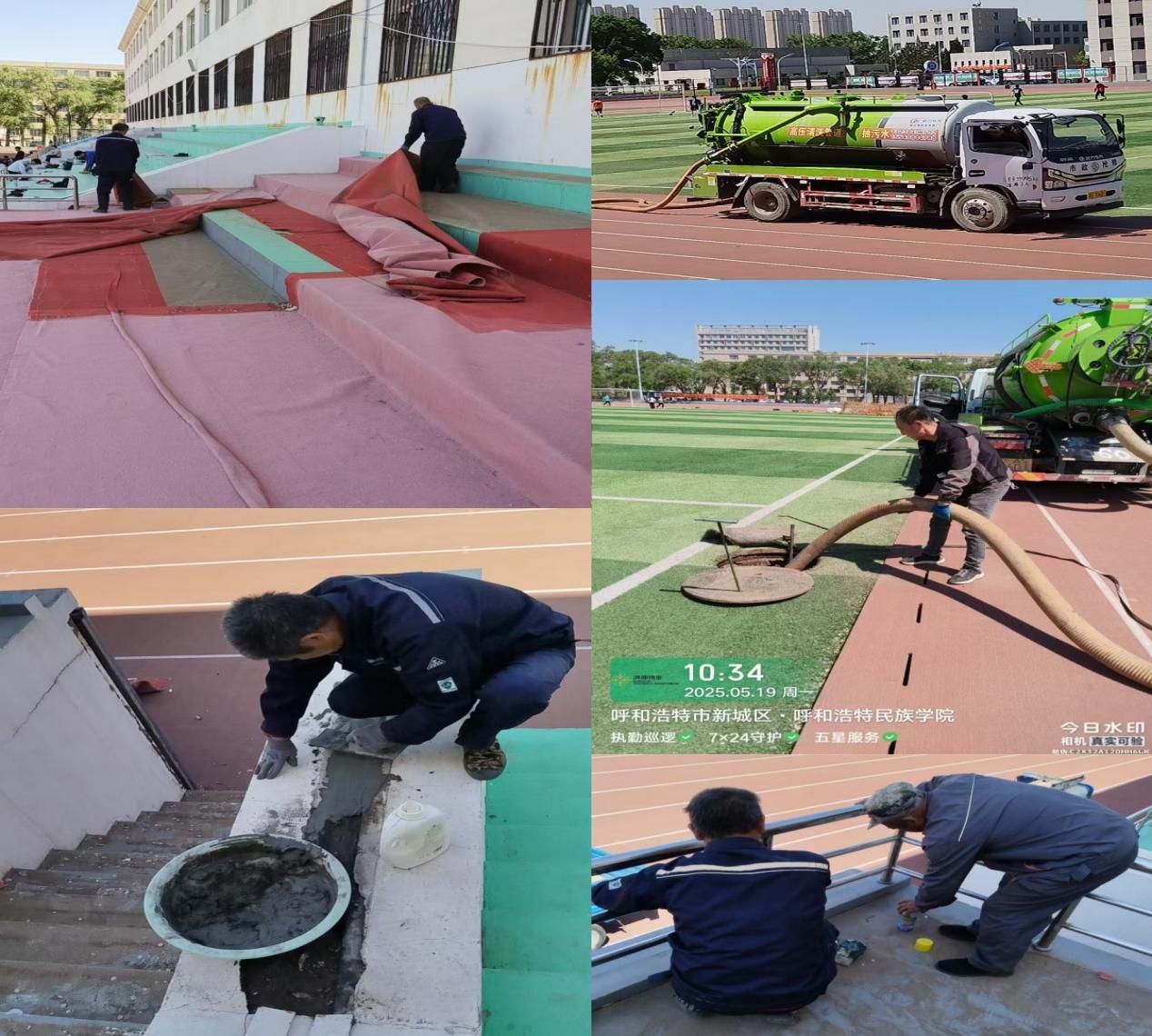 校運會籌備期間,后勤人提前對運動場地設施展開了全面細致的檢查與維護工作。從主席臺電路到廣播線路的暢通情況,到場地的深度清潔與布置,再到主席臺的修補和粉刷等,每一項都進行了嚴格把關,確保為校運會打造一個安全、舒適的環境。
