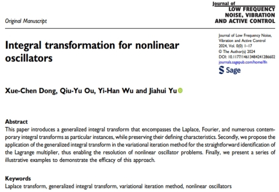近日,數學與大數據學院數學與應用數學專業2021級本科生董學晨、歐秋宇和吳怡函撰寫的學術論文“Integral Transformation for Nonlin-ear Oscillators”在國際學術期刊《Journal of Low Frequency Noise, Vibration and Active Control》上在線發表,論文通訊作者為數學與大數據學院黃大年式教師團隊于佳暉博士。