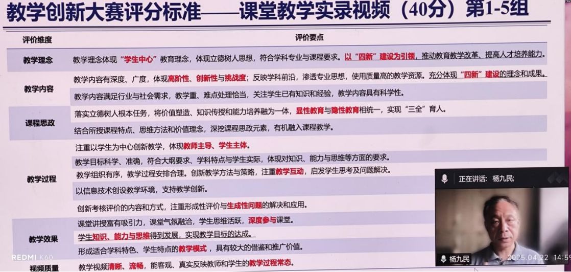 活動特邀華中師范大學教授楊九民以“教創賽注意事項解讀分享”為題做講座。楊九民深刻剖析國家及自治區大賽政策導向,以實例說明大賽對提升人才培養質量的作用,分析政策對參賽作品的教學理念、方法及評價的要求,助力教師把握方向。他指出在撰寫創新報告時,注意創新點提煉要基于教學實際問題,兼具創新性、可行性與實效性,并闡述了報告各部分寫作要點,展示范例讓教師明確標準。針對現場匯報環節,楊九民分享了語言、肢體表達和時間把控技巧,以及制作PPT輔助匯報的方法。