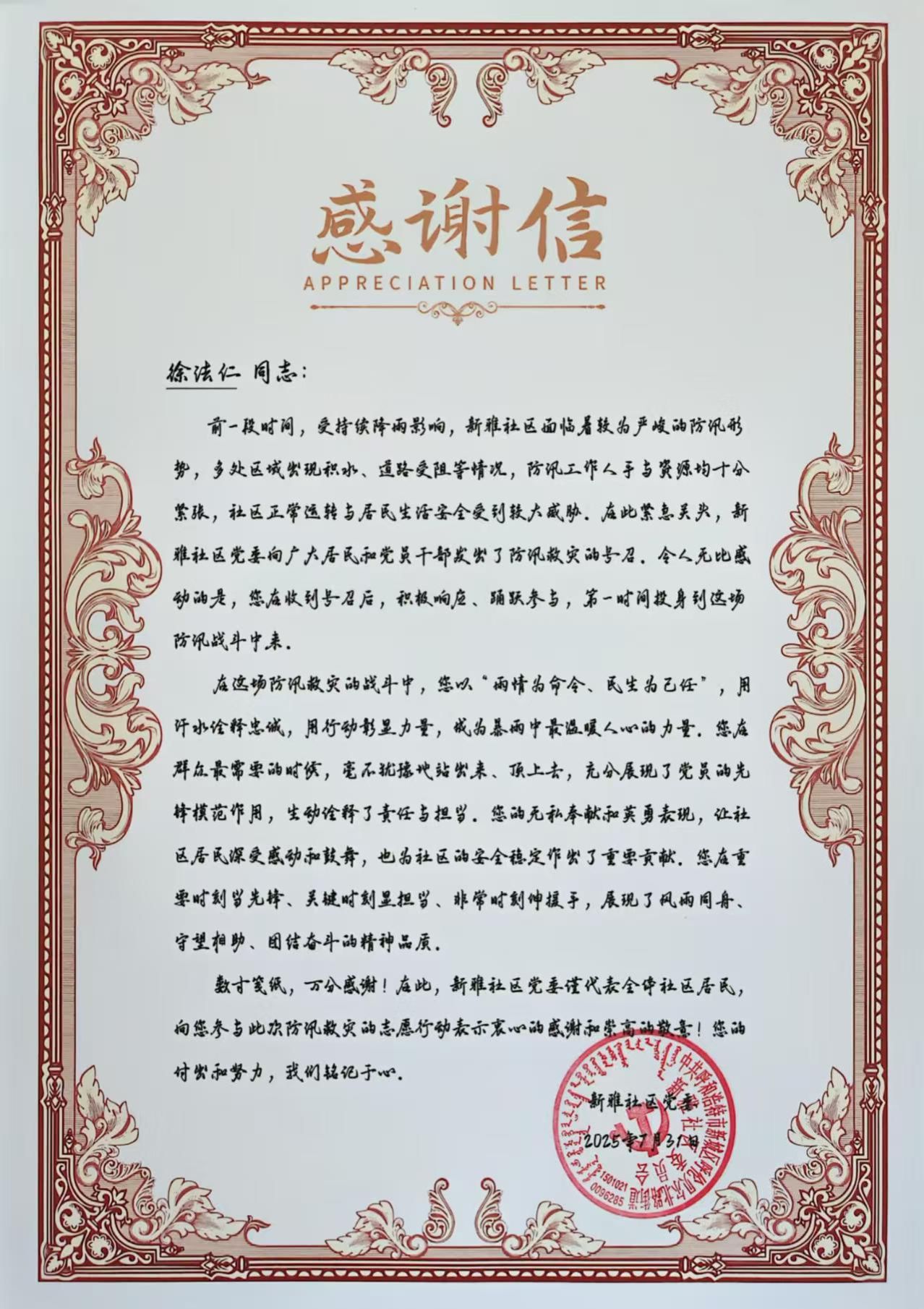 近日,學校收到新雅社區委員會發來的感謝信,對我校財務處黨支部徐法仁同志在社區抗洪救災中做出的貢獻表示了衷心的感謝和崇高的敬意!