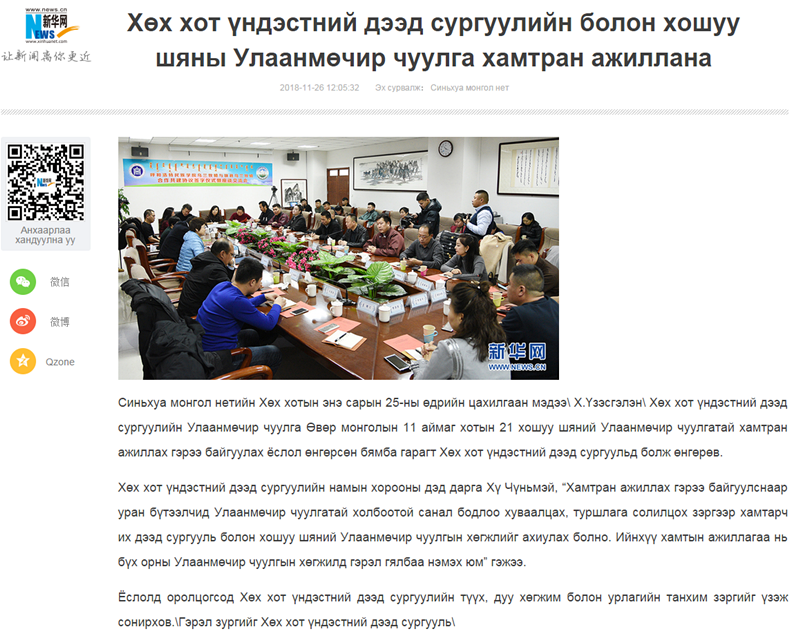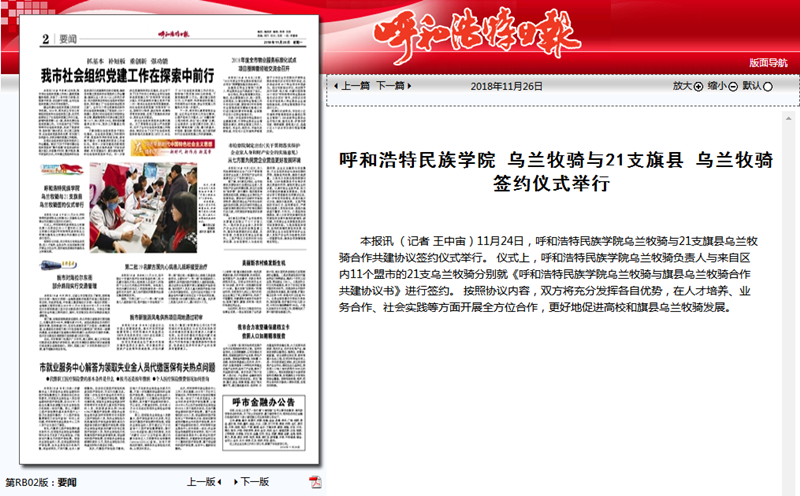 11月24日,我校烏蘭牧騎與21家旗縣烏蘭牧騎舉行舉行簽字儀式,并就下一步合作共建進行交流座談。連日來,內蒙古廣播電視臺、呼和浩特廣播電視臺、《內蒙古日報》(蒙漢文版)、《北方新報》、《呼和浩特日報》、《呼和浩特晚報》、新華網、中國新聞網、呼和浩特新聞網、呼和浩特廣播電臺等12家自治區主流媒體對活動進行了報道,內蒙古新聞網、新浪網等8家媒體進行了轉載報道。通過媒體的廣泛關注,進一步展示我校烏蘭牧騎隊伍的風采,提高了我校烏蘭牧騎的影響力。