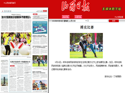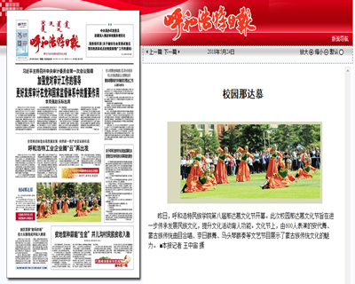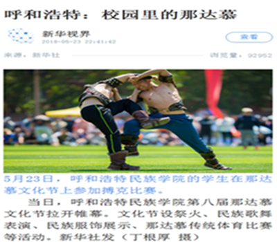 經學校黨委宣傳部的大力推廣和團委、網絡中心、保衛處、后勤管理處、體育系等部門的協助,本次那達慕文化節的媒體宣傳工作實現了歷史性突破。截止到5月28日,共有30家新聞媒體進行了專題報道,媒體覆蓋廣度和宣傳報道力度是建校以來之最。其中,《中國日報》(英文名稱《China Daily》,全球發行,期均90余萬份)在顯要位置以圖片新聞報道;《中國青年報》《內蒙古日報》(蒙古語、漢語版)《呼和浩特日報》《北方新報》《呼和浩特晚報》《內蒙古晨報》7家報紙媒體進行了頭版報道,《內蒙古日報》(蒙古語版)整版報道;內蒙古衛視2個電視頻道,新華社、人民網、光明網、新華網、中國新聞網等11家網站,中央人民廣播電臺、中國蒙古語廣播電臺、內蒙古廣播電臺蒙古語頻道、呼和浩特新聞廣播等3家電臺,影像內蒙古、北疆大學生、內蒙古客戶端、內蒙古日報等4家主流微信公眾號進了報道;新浪網、網易網、中國民族宗教網、《山西日報》等僅百余網站、媒體進行了轉載報道。
