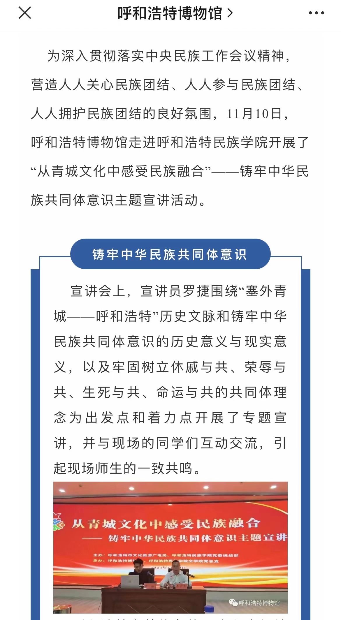 11月9日下午,由呼和浩特市文化旅游廣電局、呼和浩特民族學院黨委統戰部主辦,呼和浩特博物館、呼和浩特民族學院文學院黨總支承辦的主題宣講活動在北區圖書館一樓報告廳舉辦。活動受到社會各界的廣泛關注和大力宣傳。截至目前,共有中新網、內蒙古新聞網和內蒙古黨委統戰部官微、呼和浩特博物館官微、呼和浩特新城區民族事務委員會官微等6家校外媒體對本次活動進行了宣傳報道。