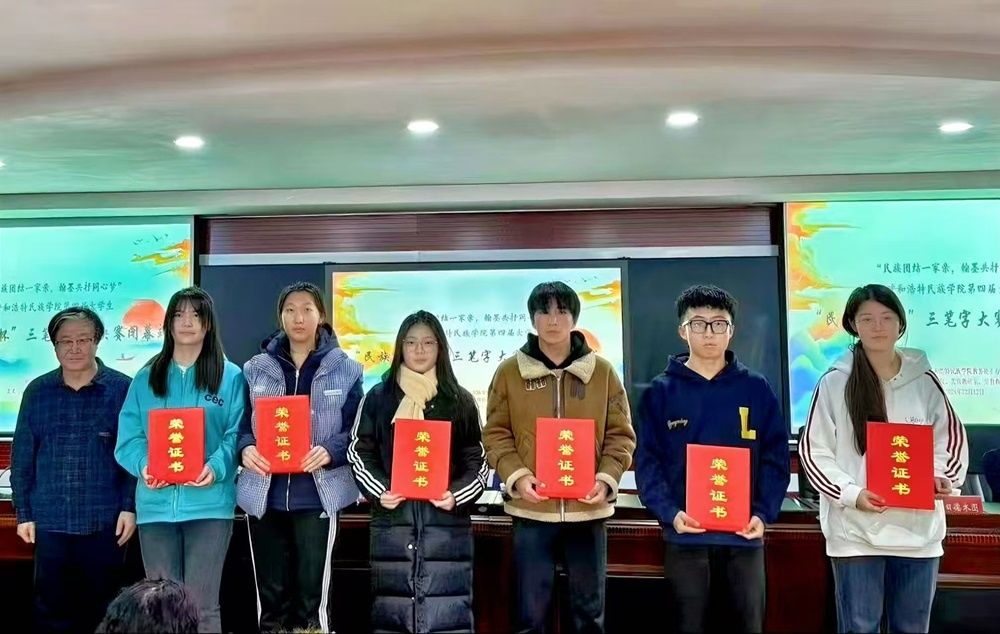 本次比賽由鋼筆字、粉筆字、毛筆字書寫三項構成,共有159名學生參加。閉幕式上,評委組長朝洛蒙從字形結構、字體規范、藝術章法等方面進行了精彩點評,為選手們優化技藝提供了富有針對性的指導意見。隨后,與會領導和評委為6名一等獎選手、12名二等獎選手、18名三等獎選手和3個優秀組織獎獲獎單位依次頒獎。