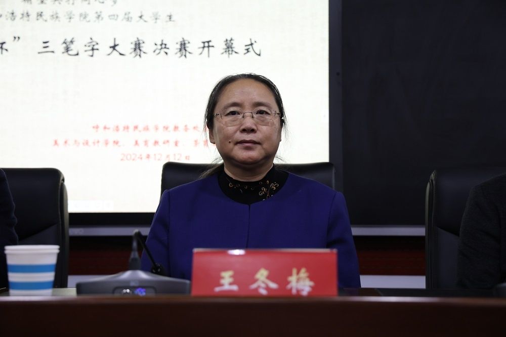 12月12日,我校“民族團結一家親,翰墨共抒同心夢”第四屆大學生“民族團結杯”三筆字大賽(決賽)落下帷幕。本次比賽由學校教務處主辦,美術與設計學院、美育教研室、勞育教研室承辦,特邀內蒙古大學出版社原副總編輯、中國書法家協會會員、西泠印社社員朝洛蒙老師,內蒙古藝術學院民族藝術研究所所長、博士烏蘇榮貴教授和美術與設計學院4位專家擔任評委,校黨委委員、紀委書記、監察專員王冬梅,黨委委員、副校長額爾敦布和出席活動并講話。