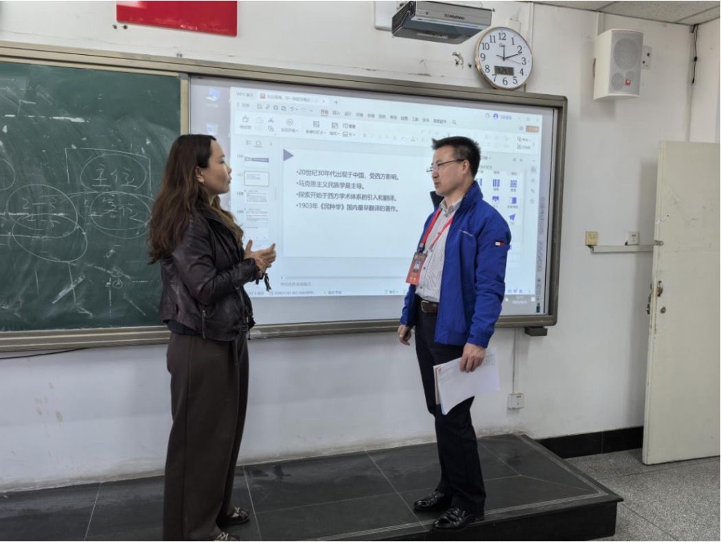 課間,額爾敦布和與兩位教師及學生進行了深入交流,在肯定了兩位教師在教學方法上的創新與嘗試的同時也及時反饋了課程設計、課堂互動等方面存在的問題。他鼓勵教師用心教書、潛心育人,不斷深化本科教育教學改革,打造受學生歡迎的“金課”,全面提升課堂教學水平和育人質量。