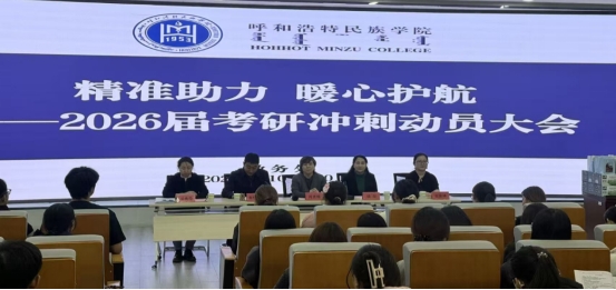 為進(jìn)一步鼓舞考研學(xué)子士氣,提供精準(zhǔn)高效的備考支持,10月20日晚,學(xué)校在鑄牢中華民族共同體意識(shí)教育館思想政治教育實(shí)踐教學(xué)基地舉辦“精準(zhǔn)助力 暖心護(hù)航”2026屆考研沖刺動(dòng)員大會(huì)。會(huì)議由教務(wù)處副處長(zhǎng)青格樂圖主持,2026屆考研班100余名學(xué)生參會(huì)。