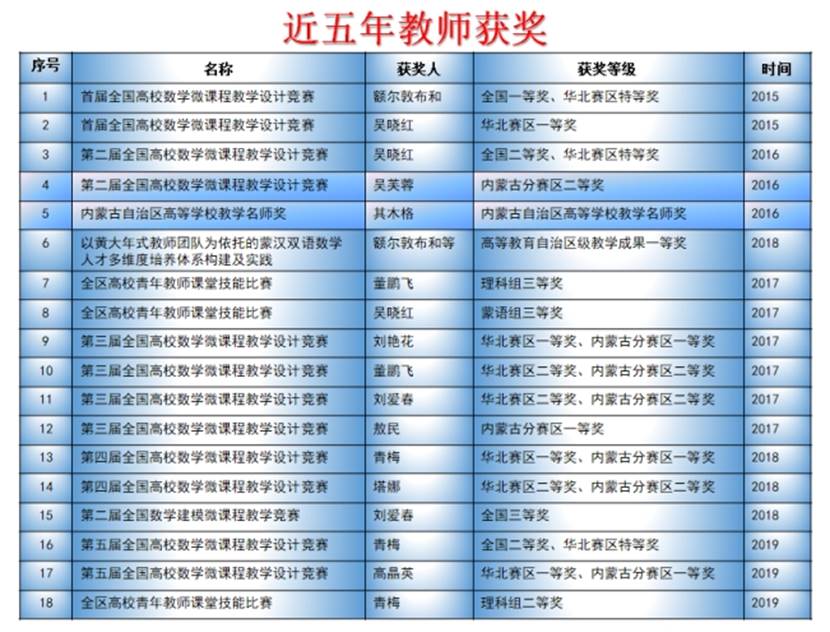 天道酬勤,一樹百獲。近幾年,該專業師生先后獲得全國高校數學微課程教學設計競賽全國一、二等獎;全國大學生數學建模競賽二等獎等50多項省部級各類獎項;現有自治區高等學校在線開放課程2門(2018年)和精品在線開放課程(金課)1門(2021年);建設自治區高等學校實驗教學示范中心(2017年)1個和教育部民族教育發展中心重點研究基地(2015年)1個,掛靠學校成立內蒙古高等教育學會數學教育分會(2016年);先后20多名學生考取太原理工大學、陜西師范大學、內蒙古大學等高校碩士研究生,其中3人分別直推為武漢科技大學和內蒙古大學的博士研究生。特別是,2018年實現學校高等教育自治區級教學成果一等獎零的突破。