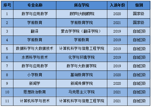 目前,我校已有2個本科專業(yè)獲批國家級一流專業(yè)建設點;先后9個本科專業(yè)入選自治區(qū)級一流本科專業(yè)建設點行列,占招生專業(yè)數(shù)的23.08%。