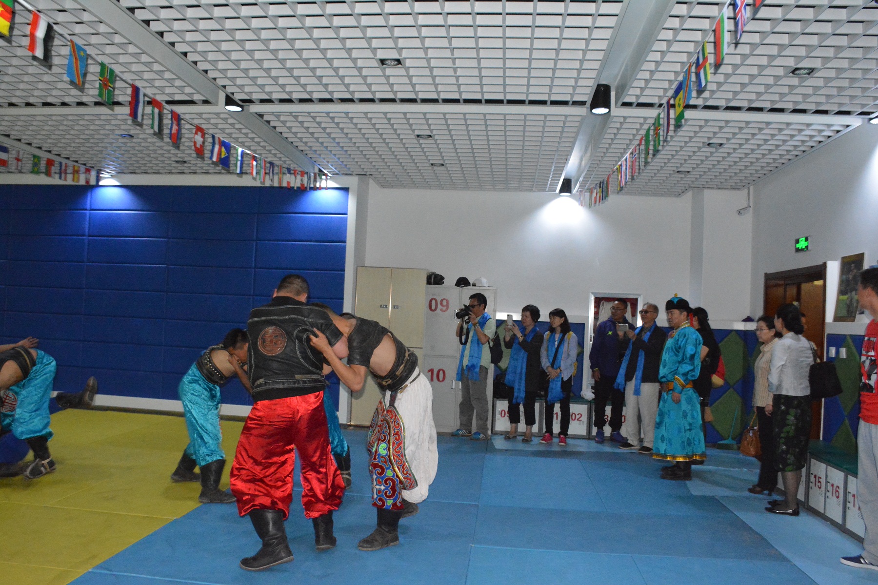 盧沃棠先生一行首先參觀了我校體育館,現場體驗及詳細了解了蒙古族“搏克”、“民族健身操”、“沙嘎游藝”、“沙嘎哈日靶”、“蒙古象棋”、“包根吉日格”、“傳統射箭”、“傳統布魯”等傳統教學項目。隨后,視察了校園及周邊環(huán)境,現場聽取了學校工作情況匯報,并就有關問題與校領導進行了交流。