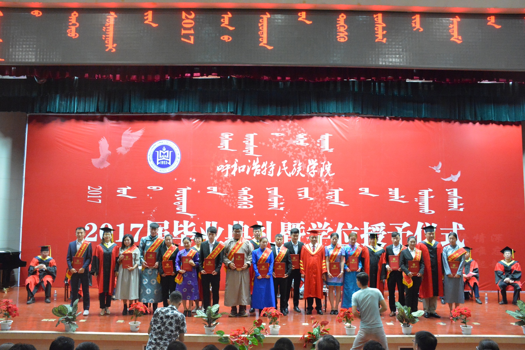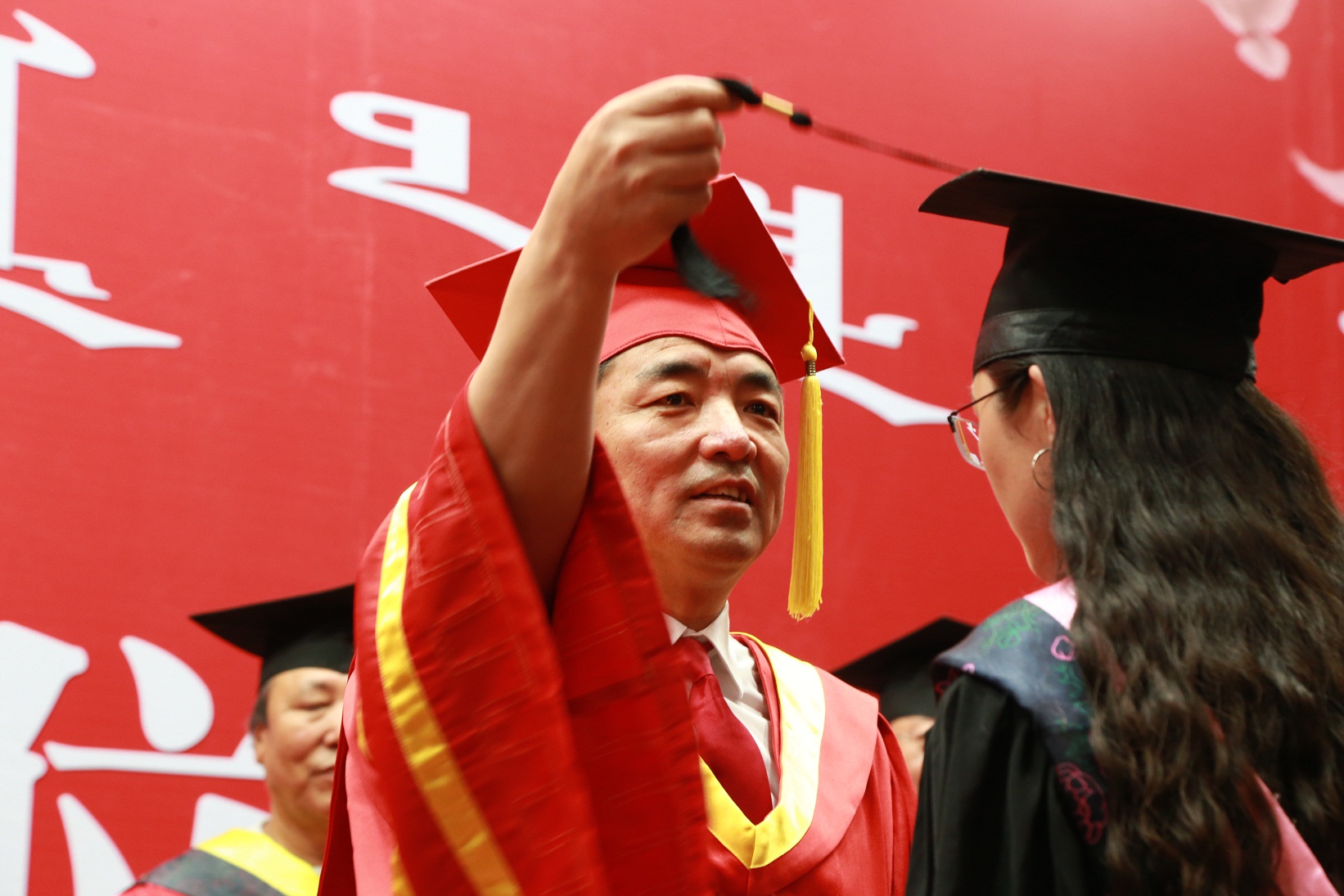 儀式上,教務處副處長胡畢斯哈拉圖宣讀了學校2017屆學生畢業情況;全體學校領導為2017屆畢業生頒發了畢業證書。學校學位委員會主任格日樂圖院長及主席臺領導為獲得學士學位的畢業生代表授予學位并行撥穗禮。主席臺上的每一位老師與畢業生握手祝賀、畢業快樂、撥穗行禮、合影留念,與同學們簡短交流,祝福同學們前程似錦。