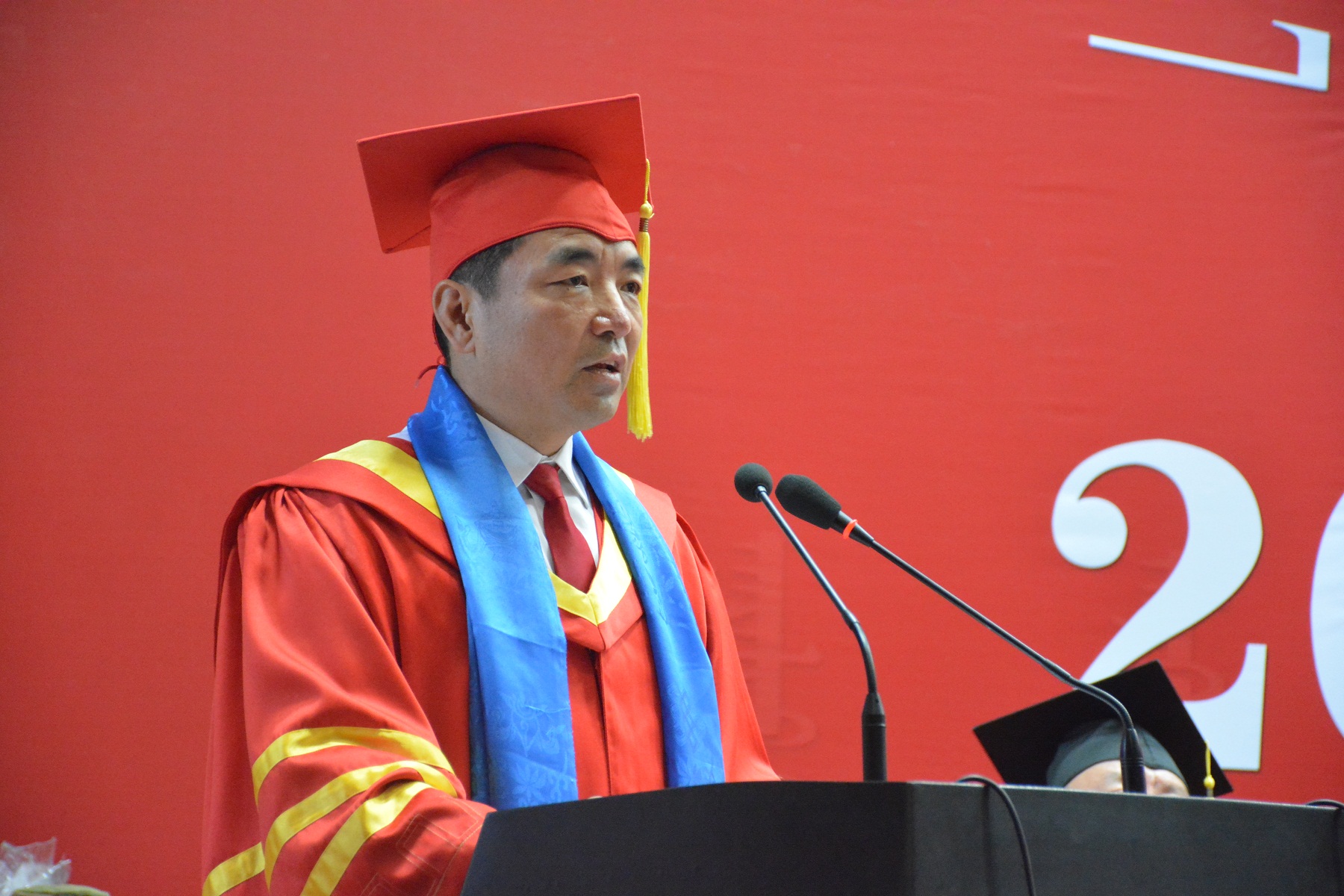 師生代表發言結束后,格日樂圖院長殷切致辭,為畢業生上了最后一堂課。他首先代表全體師生員工,向圓滿完成學業的全體畢業生表示熱烈的祝賀和誠摯的祝福,向悉心指導和培育的老師們及關心關愛的父母家人表示感謝。格院長表示,2017屆畢業生在四年的學習生涯中勤奮學習、勇創佳績,為學校發展的史冊再添奪目篇章。格日樂圖院長希望各位畢業生胸懷夢想、修身養德、勇往直前,希望考取研究生的同學們繼續發揚拼搏精神、優良作風、時代精神。同時祝愿學生珍惜昨天的態度,放飛今天的夢想,書寫明天最璀璨的華章。