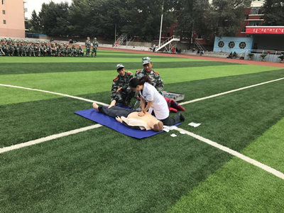 劉晉雯醫生首先講授了心肺復蘇術的理論知識,并對急救的整個流程及注意事項進行了演示與詳細講解。隨后,現場組織新生進行分組演練。在此次培訓活動中,由承訓部隊教官配合實踐操作培訓演示,并讓各連同學通過復蘇模擬人進行了實際操作。