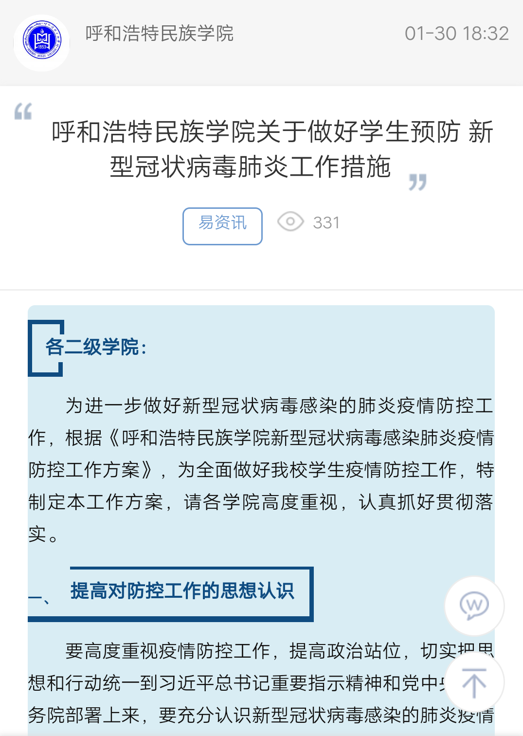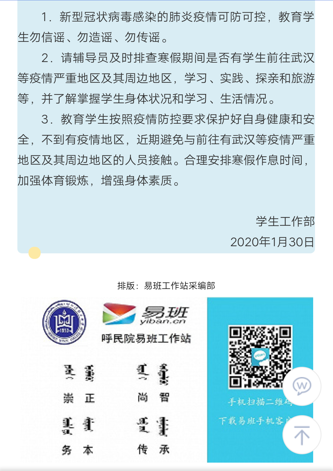 上一條:蒙文版來了!致呼和浩特民族學院全體師生的一封信 下一條:關于延期開學的通知