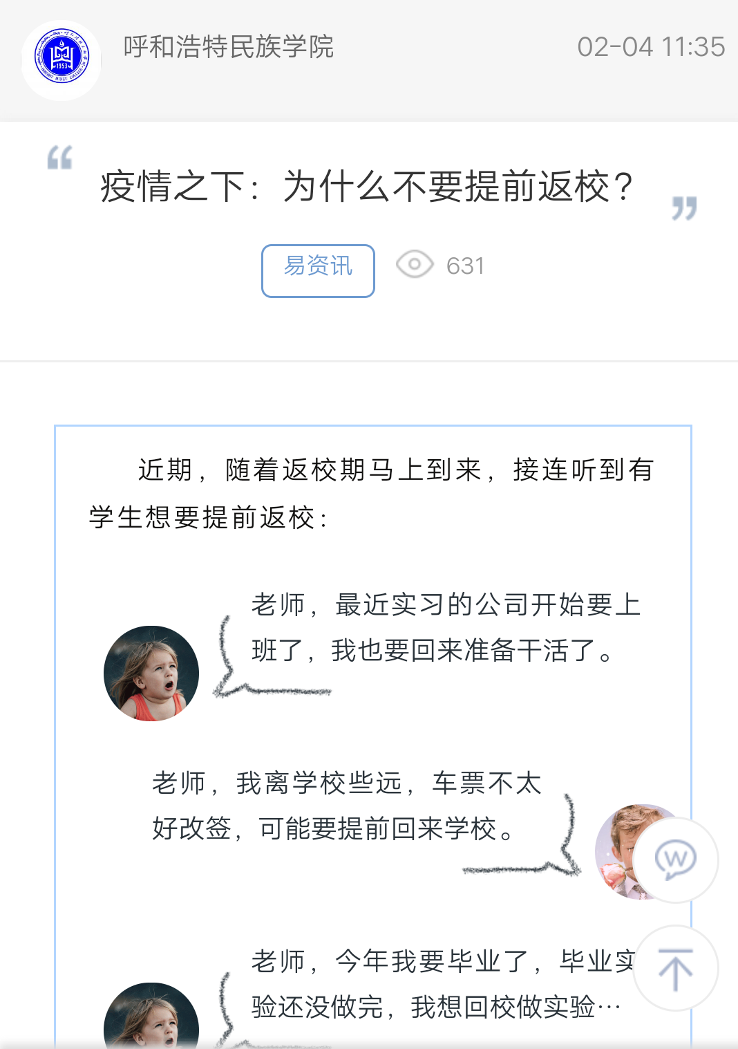 上一條:呼和浩特民族學(xué)院 應(yīng)對新型冠狀病毒肺炎疫情心理援助計(jì)劃 下一條:這周是防控重點(diǎn)!