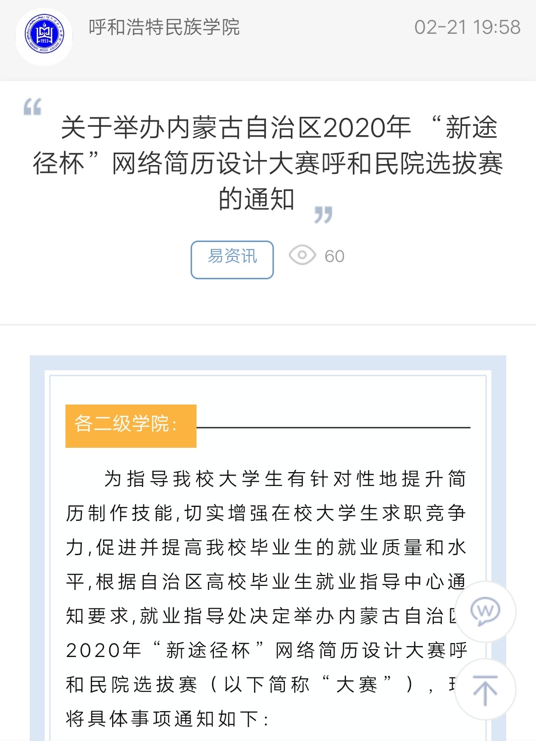 關于舉辦內蒙古自治區2020年“新途徑杯”網絡簡歷設計大賽呼和民院選拔賽的通知
